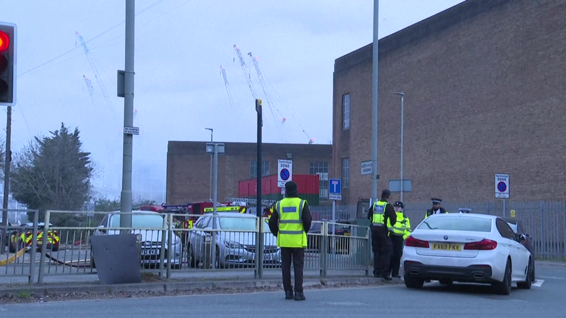 Images of police officers and cordon on a street as emergency services respond to a fire at the Hayes electrical substation which caused a power outage forcing Heathrow airport to shut down.