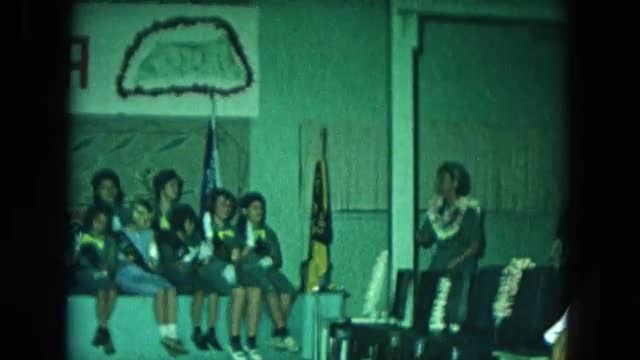 649898 - 1966: a group of children sitting under a sign that says "aloha" performing a song. CALIFO
