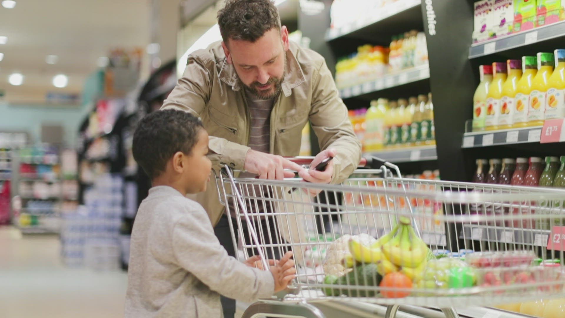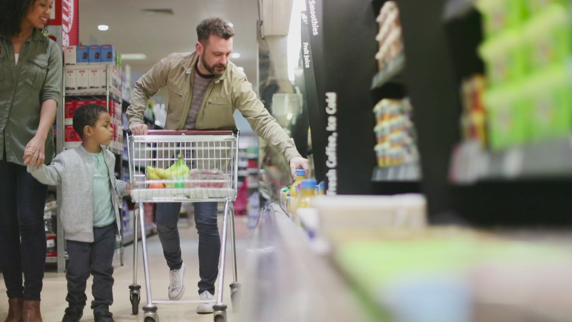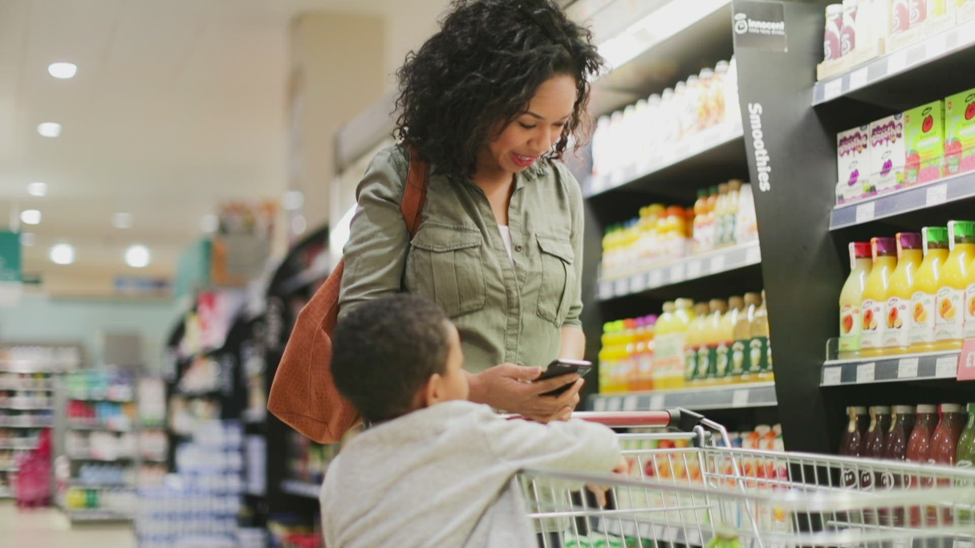 673598 - Senior lady with shopping basket in hand, strolling through the supermarket, then she picked somethi