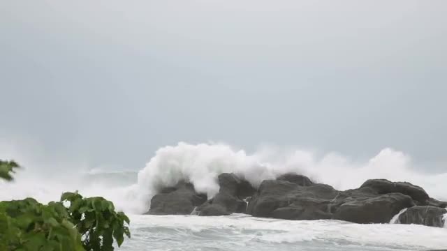 Waves arrive ahead of storm, night, moving left to right, 4K