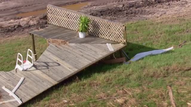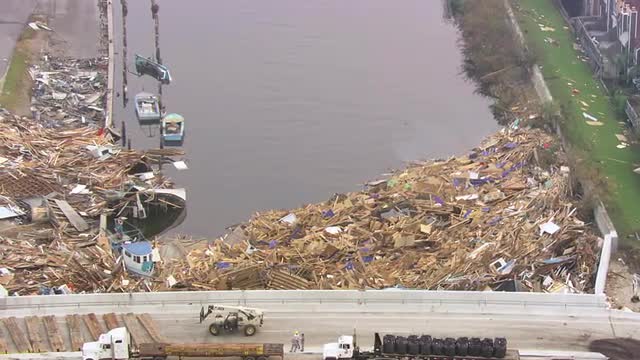 755081 - MS POV AERIAL Cars destructed due to natural disaster / United States