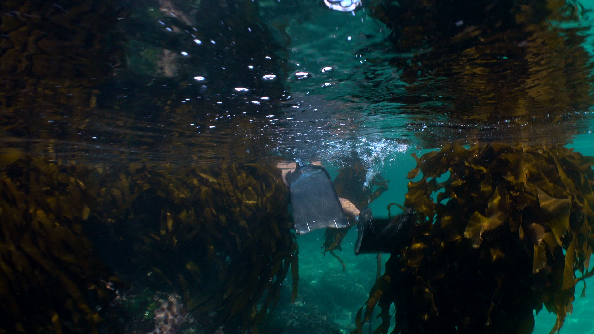 2560832 - Group of snorkellers swimming through gaps in a kelp forest