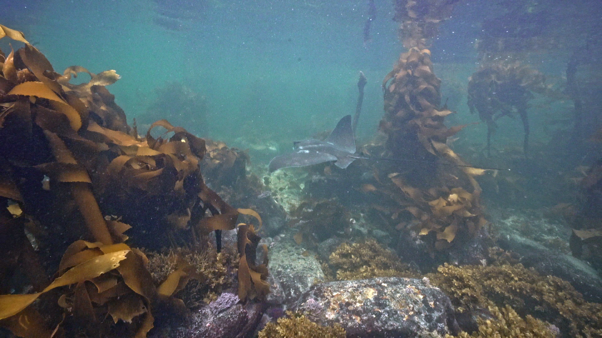 2560683 - Eagle ray moving through a kelp forest towards open water