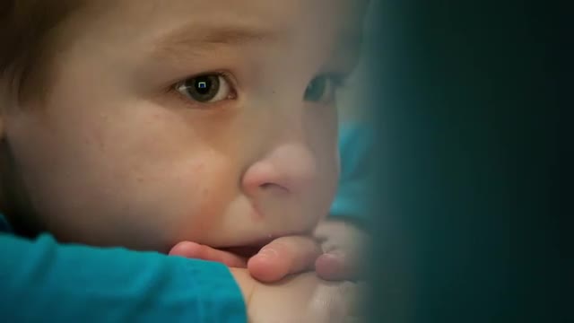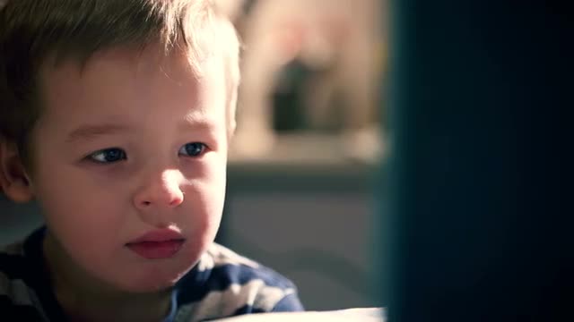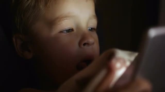 Child using tablet PC with screen shining in the darkness.