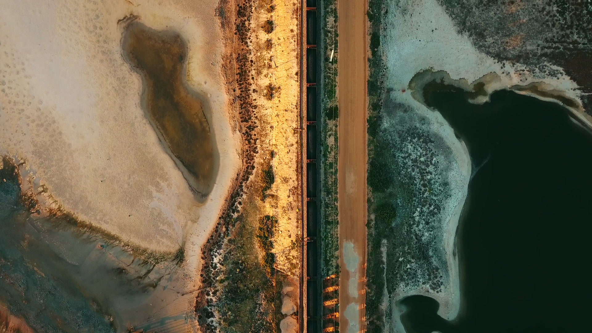 > Train cars filled with coal on a coastal railway line