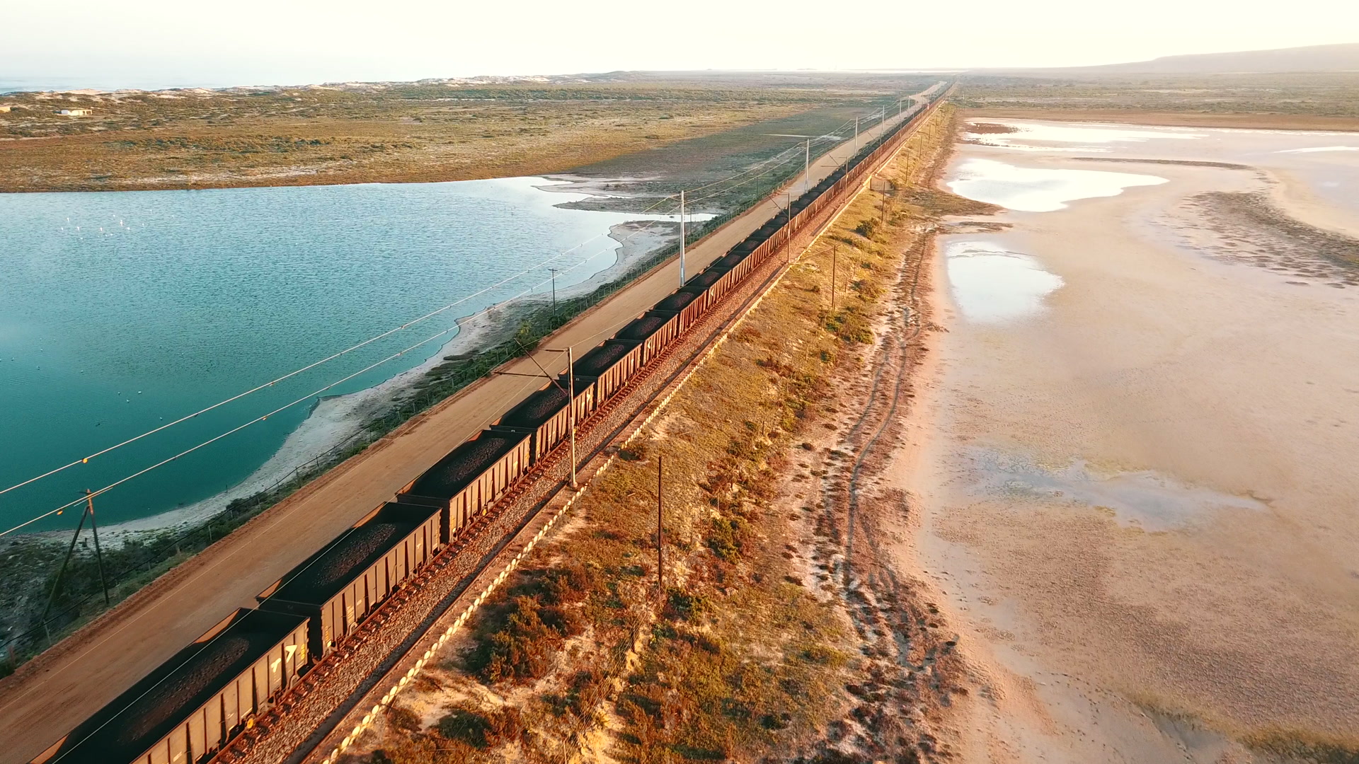 Train cars filled with coal on a coastal railway line