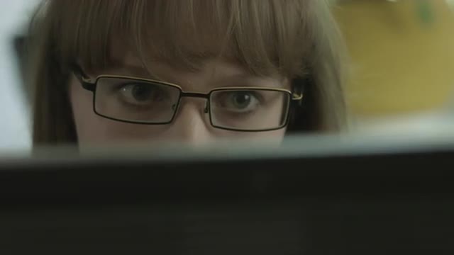 Dolly shot of a woman surfing internet at night with only eyes in focus