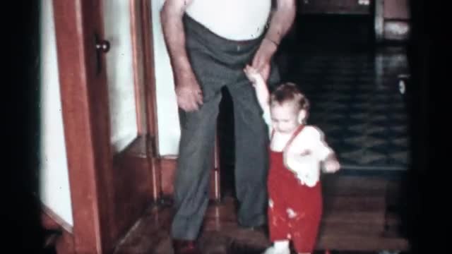 Panning shot of elderly woman moving slowly in the corridor at home with the aid of walker