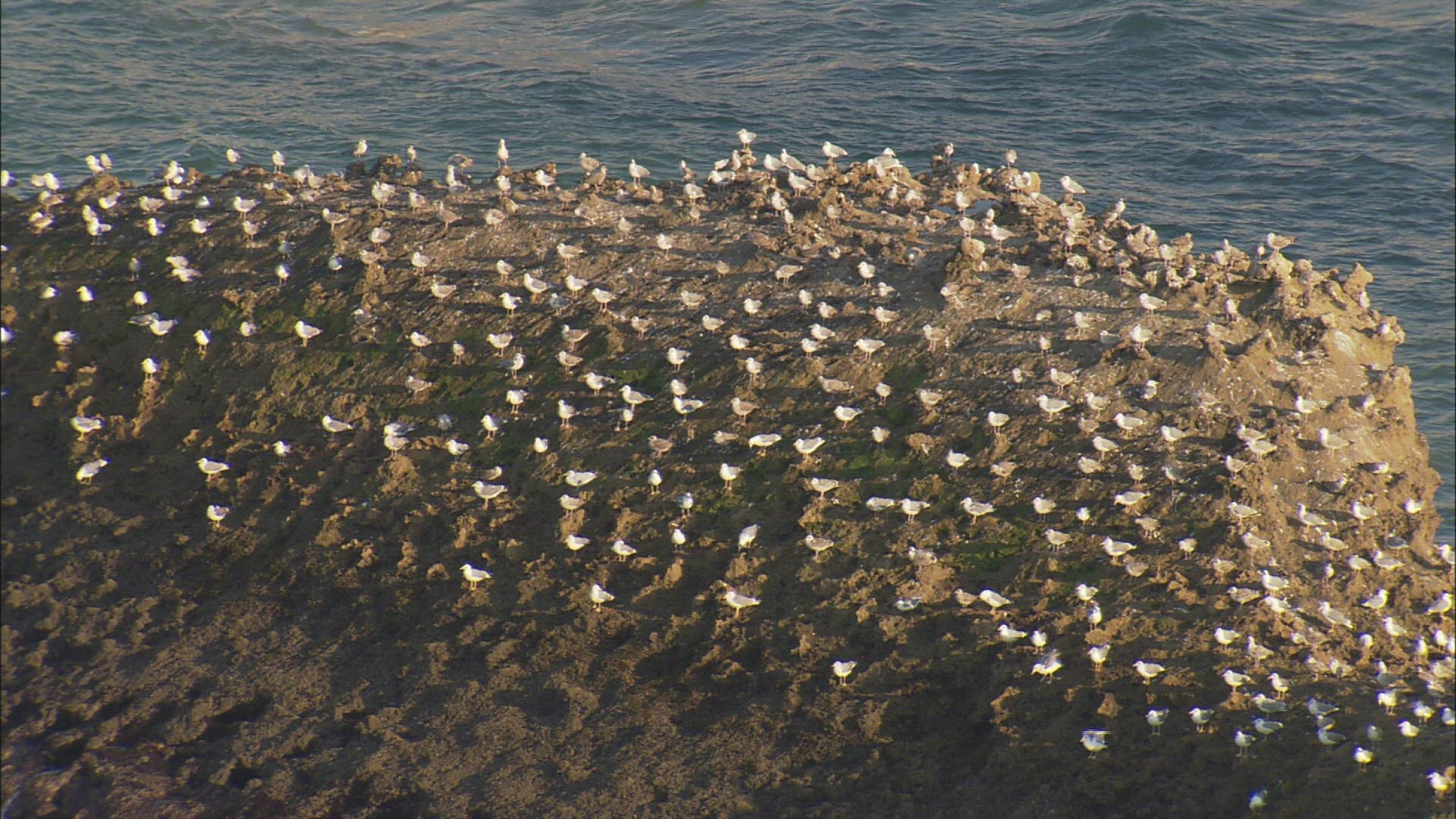 A flock of terns landing on a rock