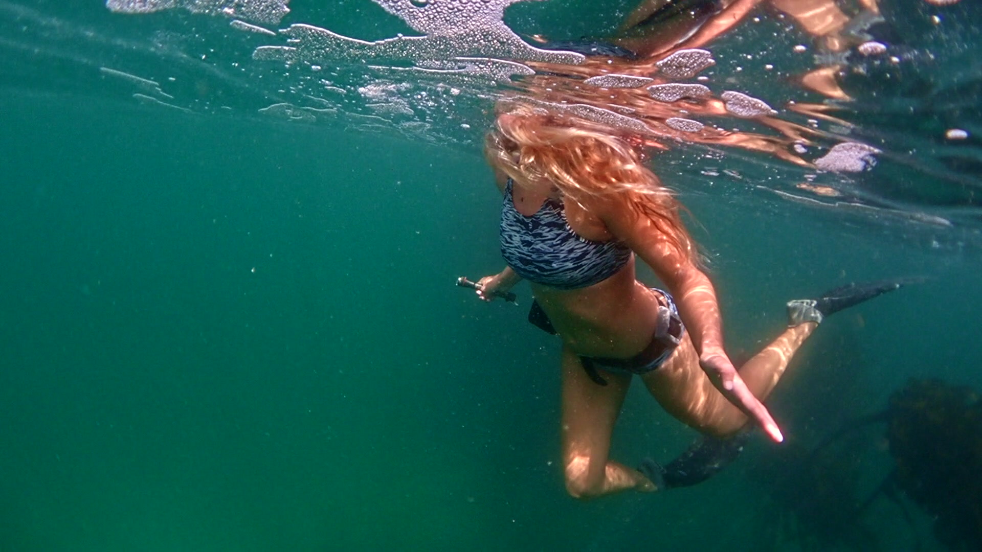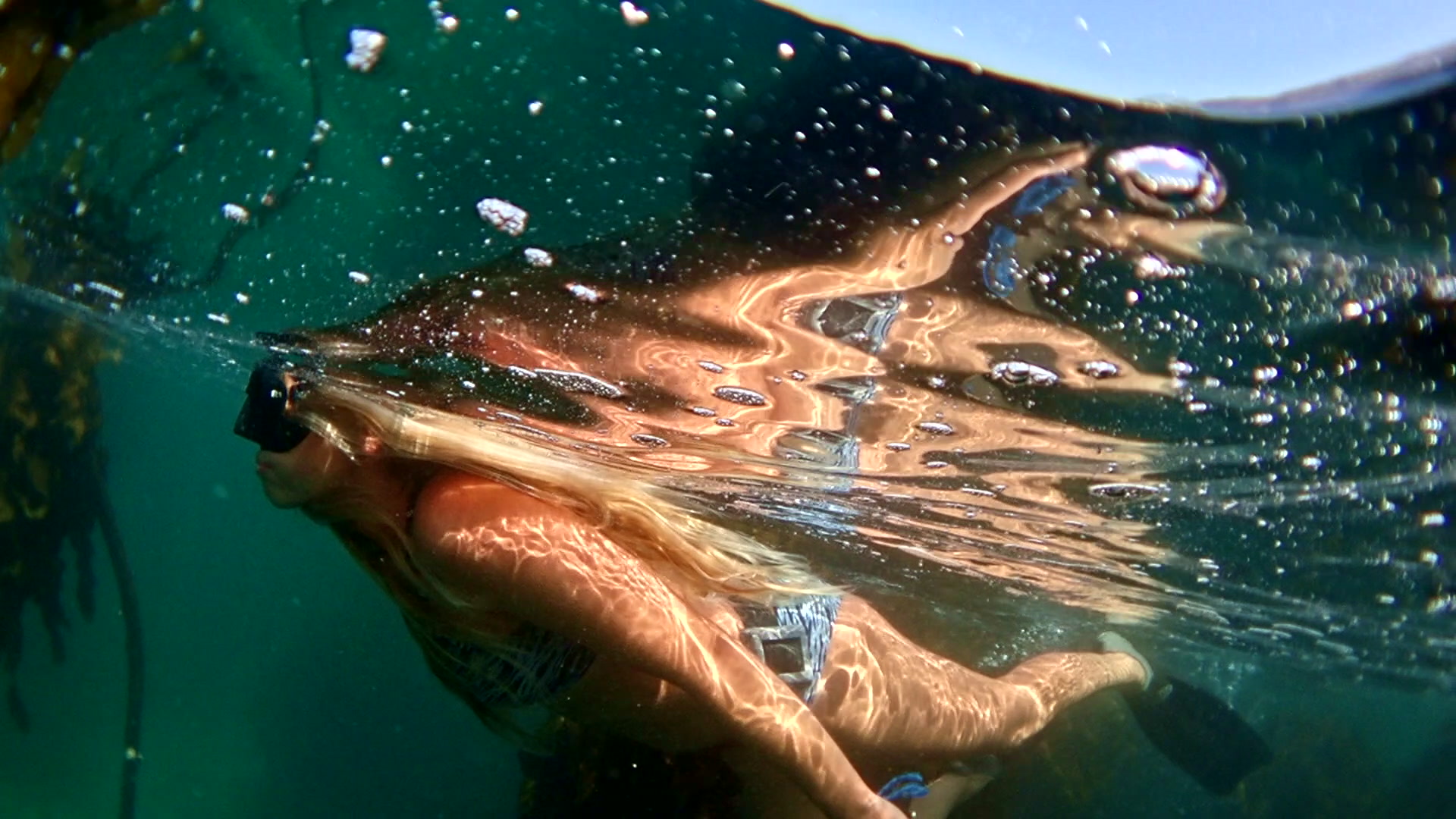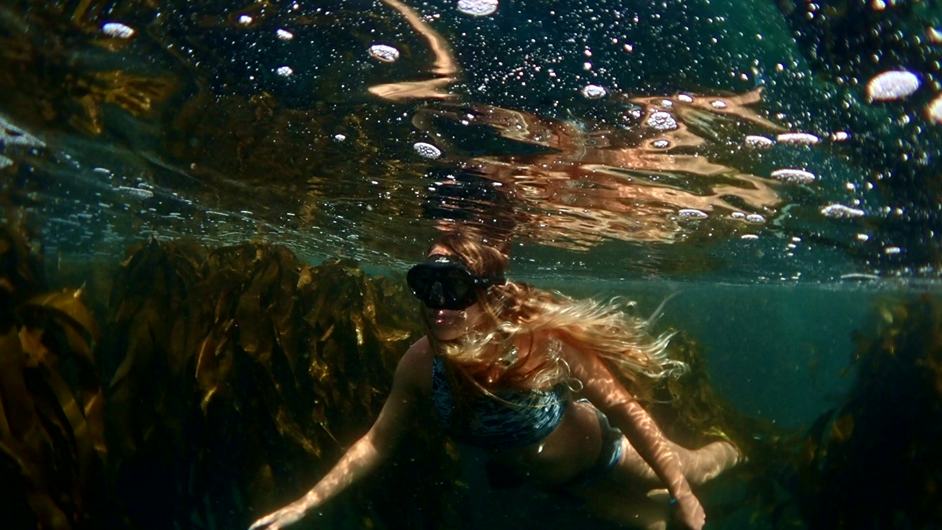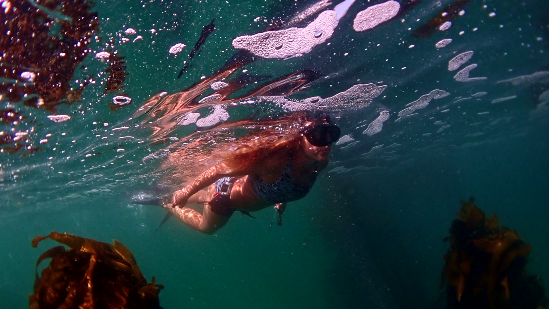 > A puffadder shyshark swimming along the sea floor in between the holdfasts of sea bamboo