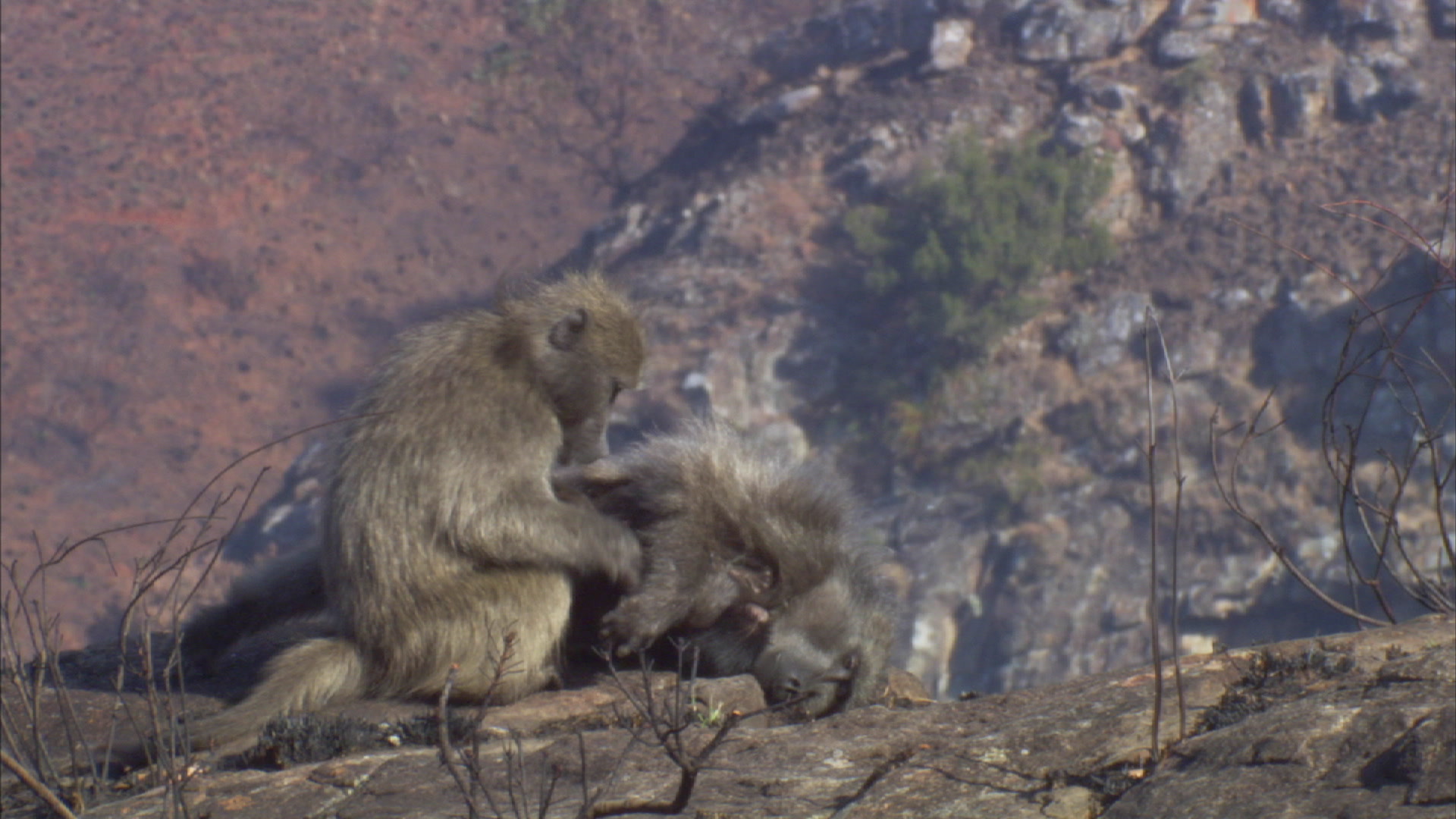 2560992 - Locked off shot of a baboon looking for food on top of a mountain, overlooking a valley