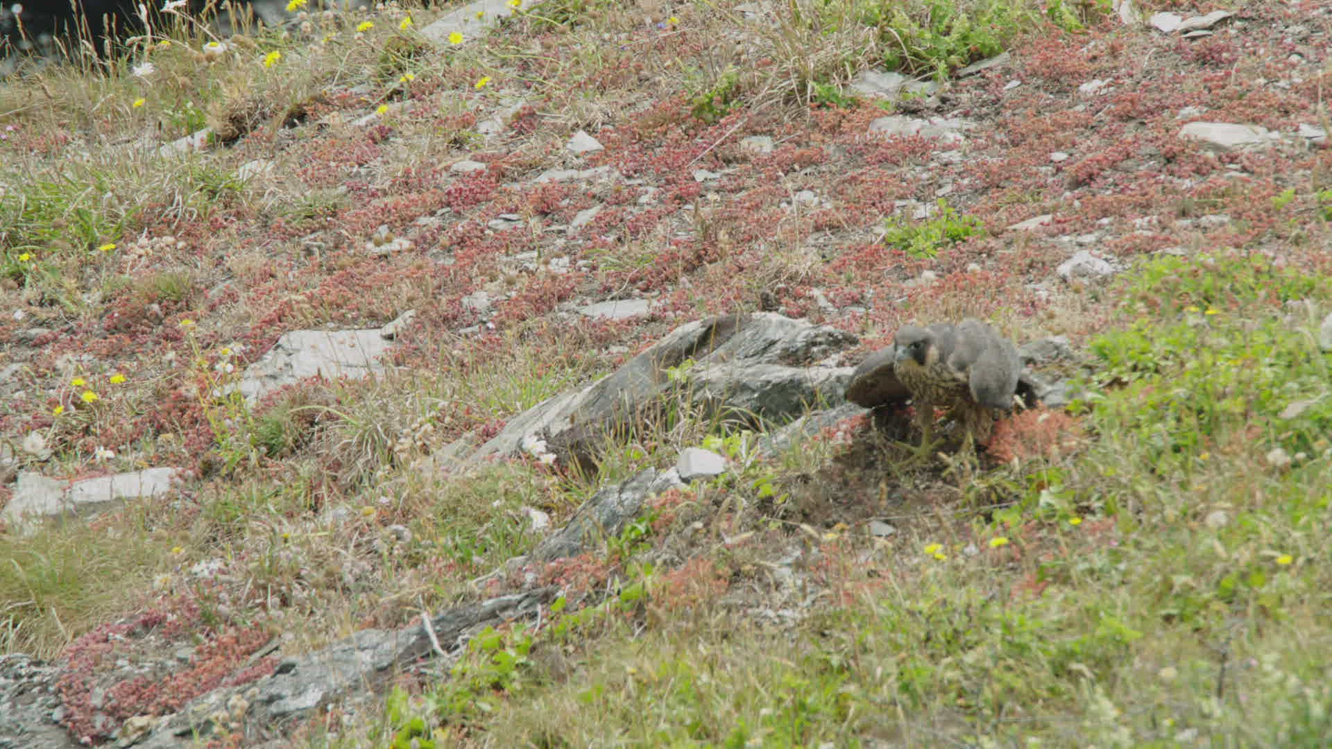 > Locked off shot of a vulture sitting on a rocky cliff, over-looking a valley