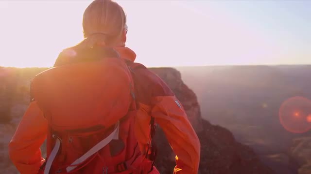 Distant view of lone female hiker on a high plateau overlooking a calm sea in the Arctic region