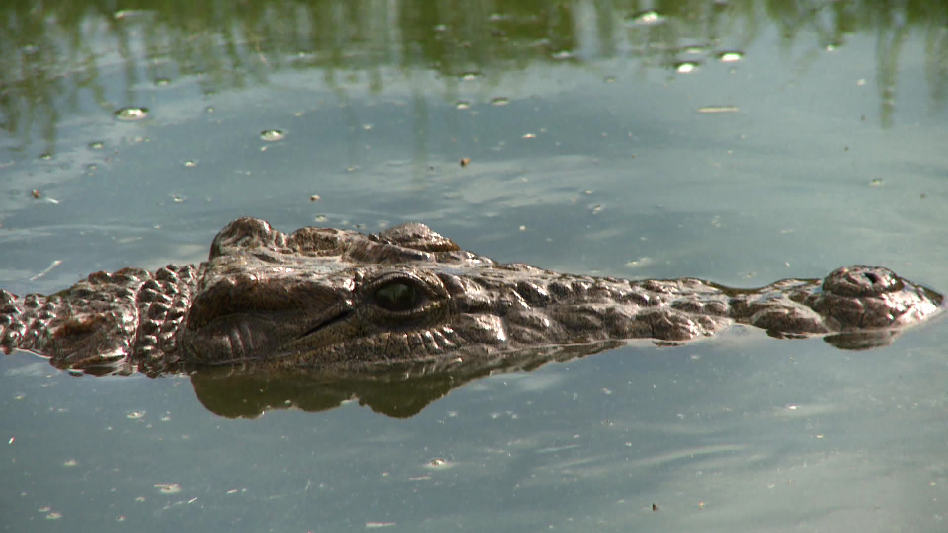 > Handheld shot of a crocodile floating in the river