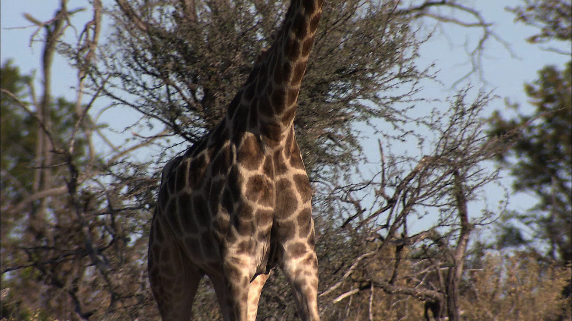 Tilt up of a giraffe walking through the bush