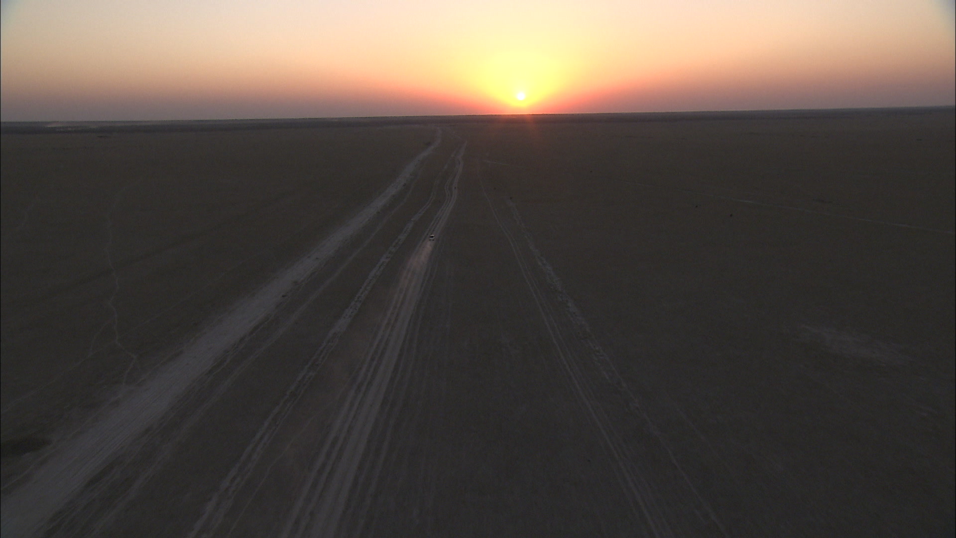 > Aerial shot of a car driving across the Makgadikgadi Pan