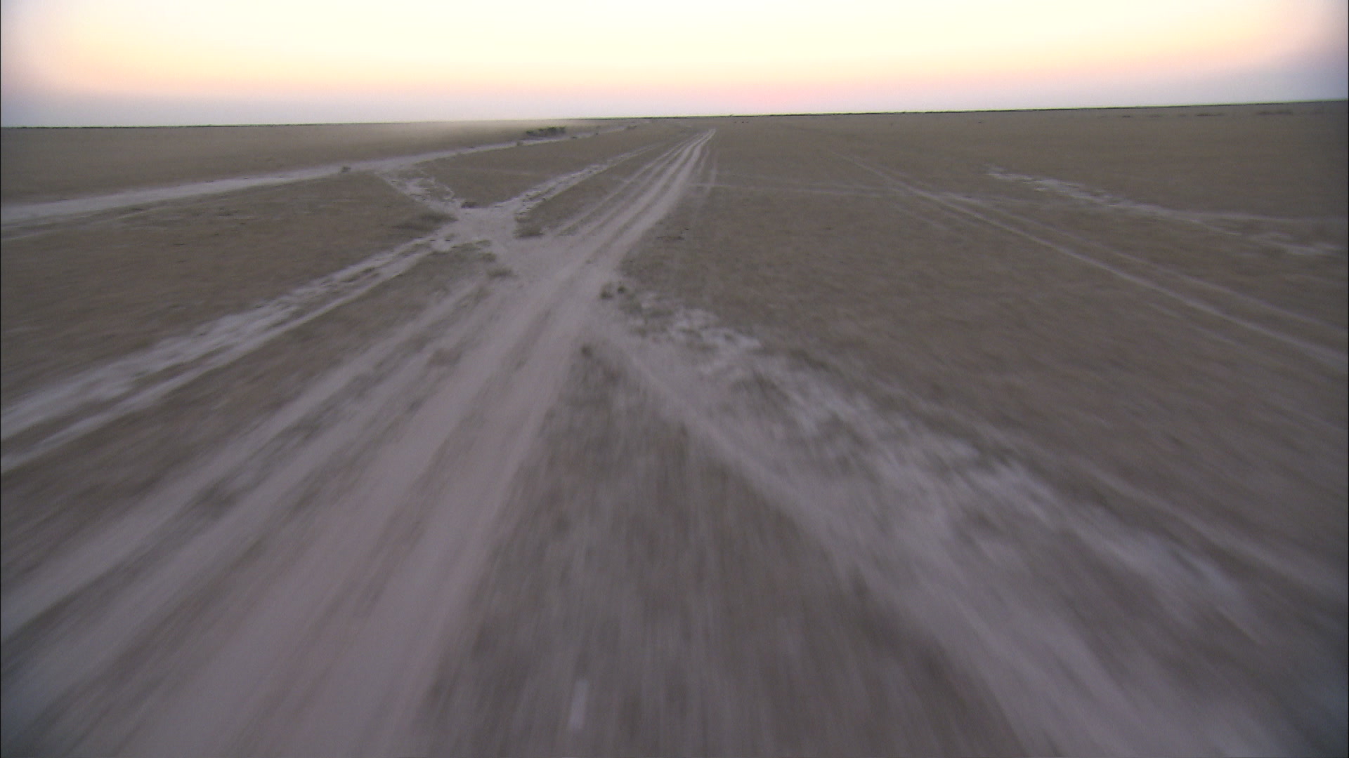 > Aerial shot of a car driving across the Makgadikgadi Pan