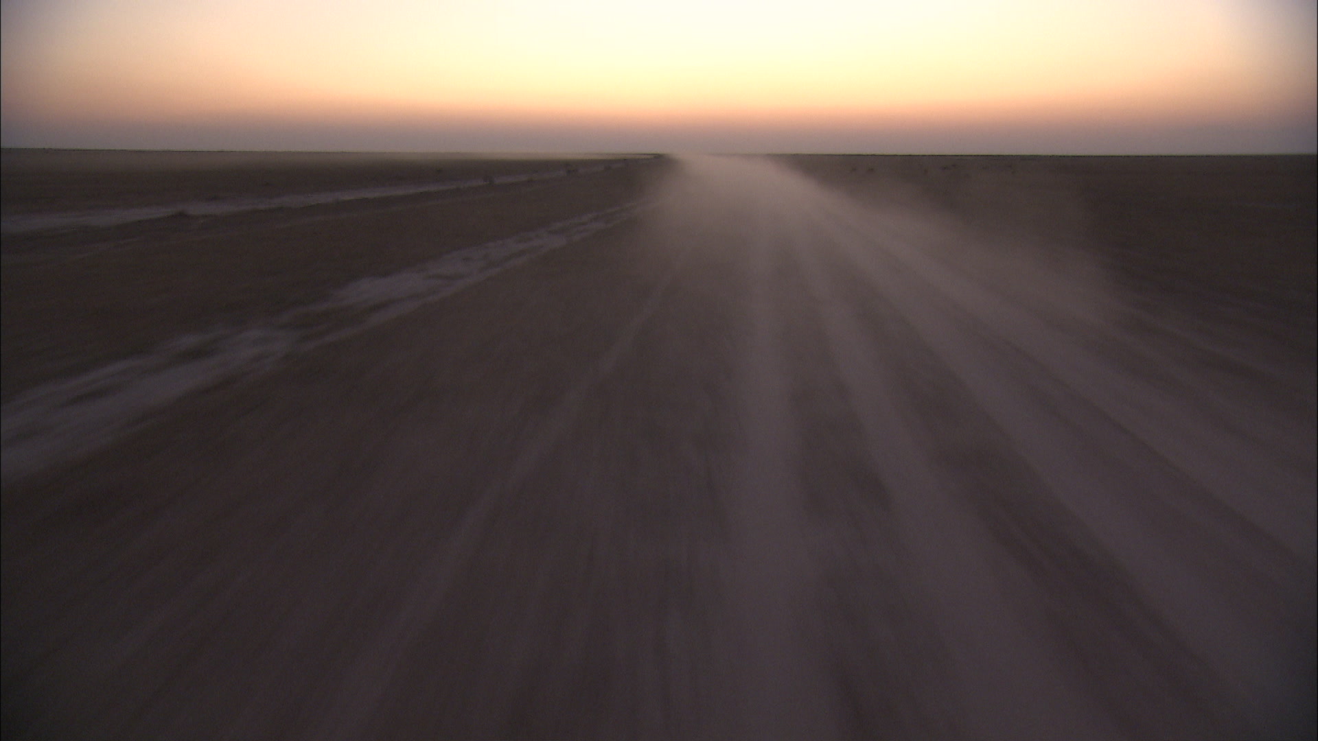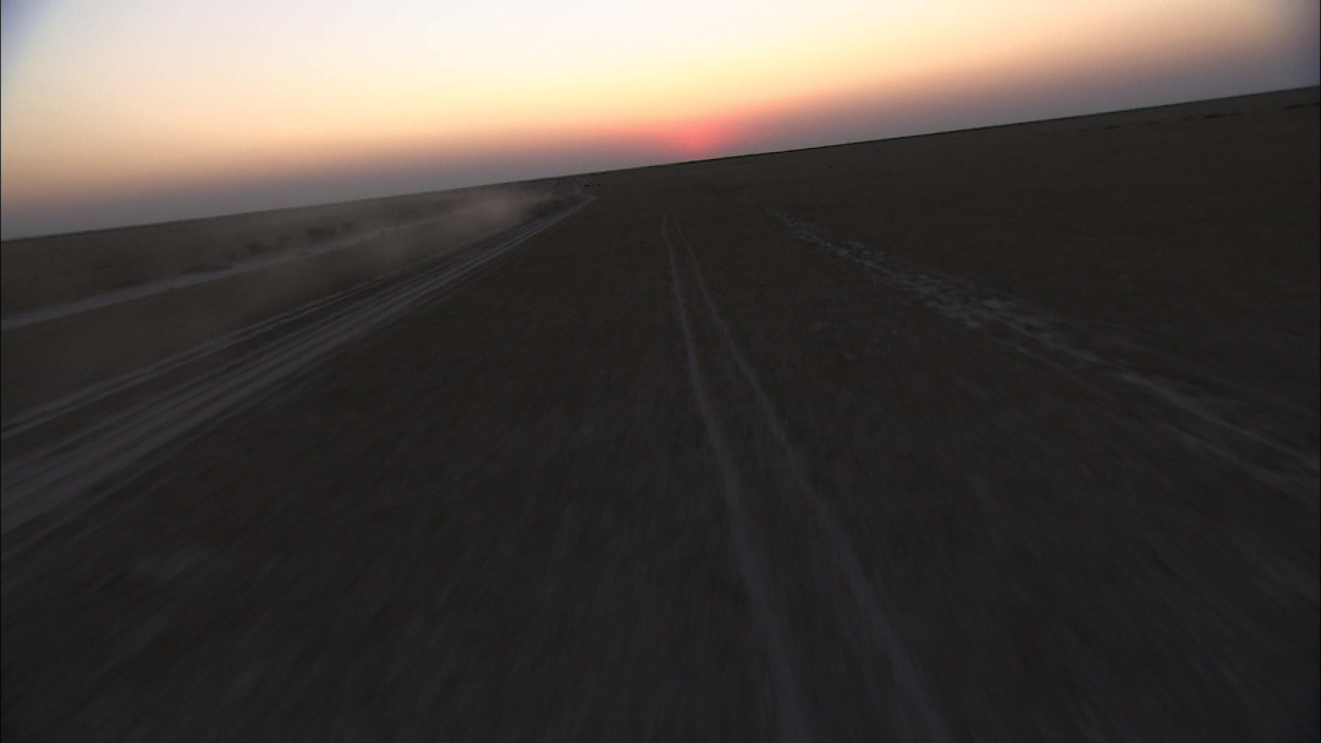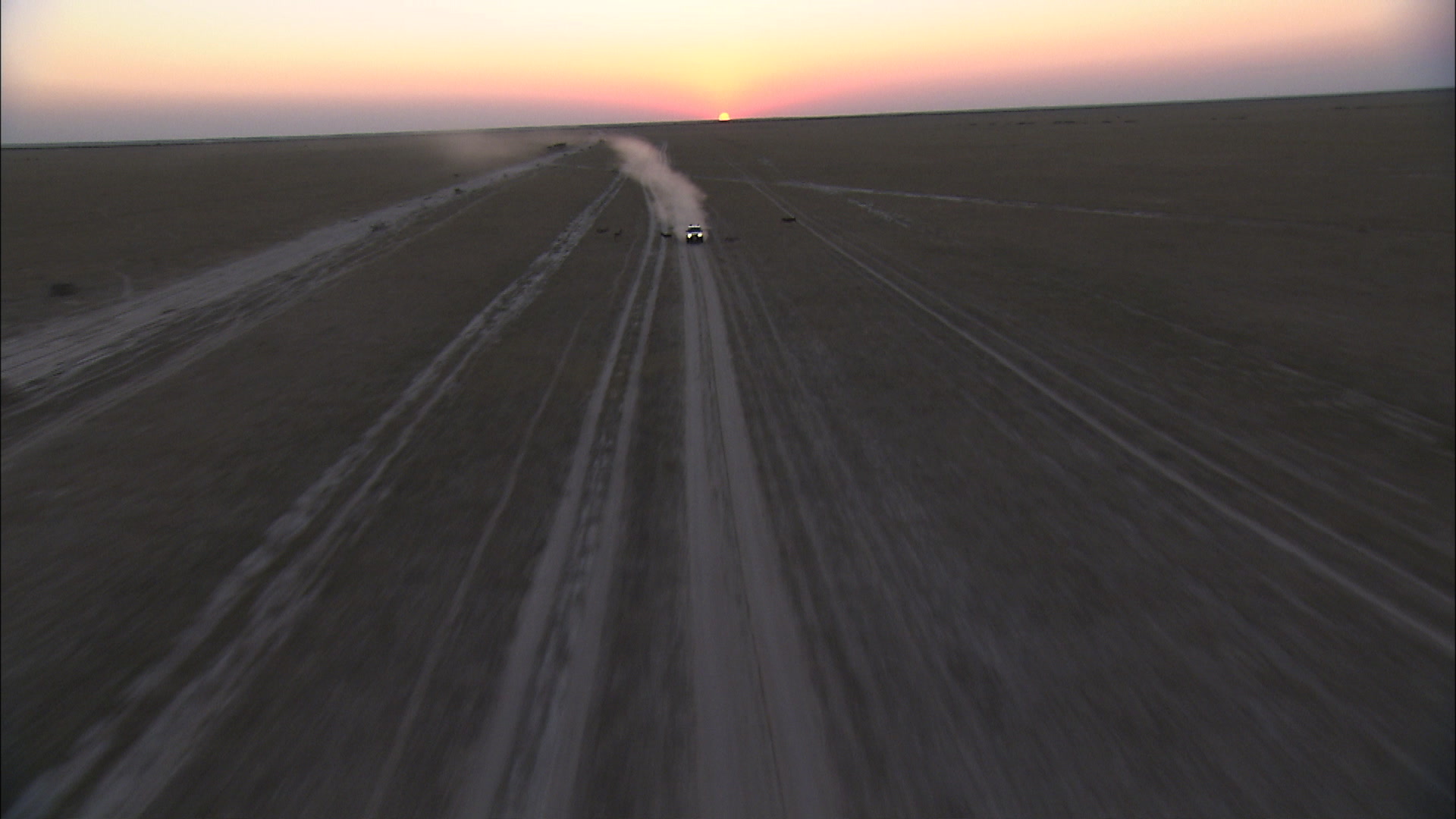> Aerial shot of a car driving across the Makgadikgadi Pan