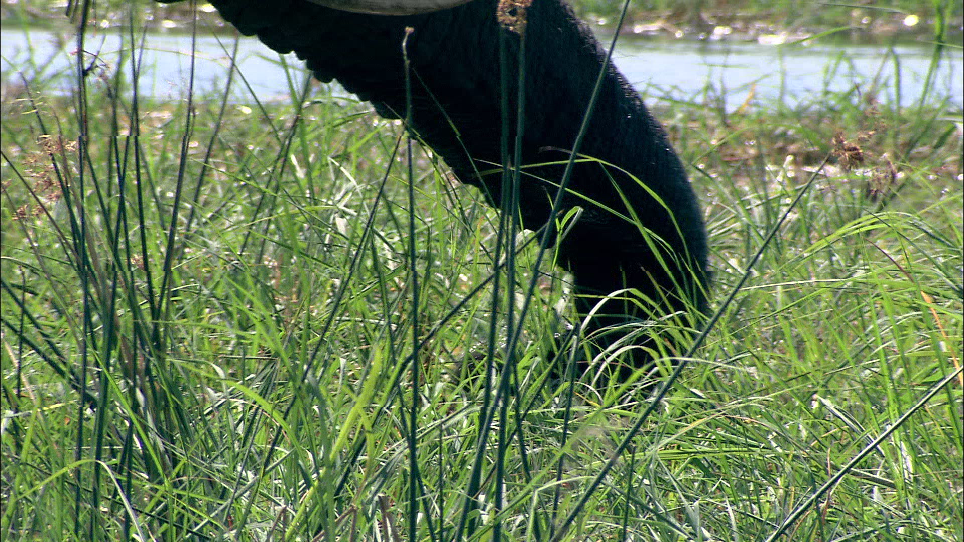 > Handheld Close-up shot of an elephant using its trunk to eat