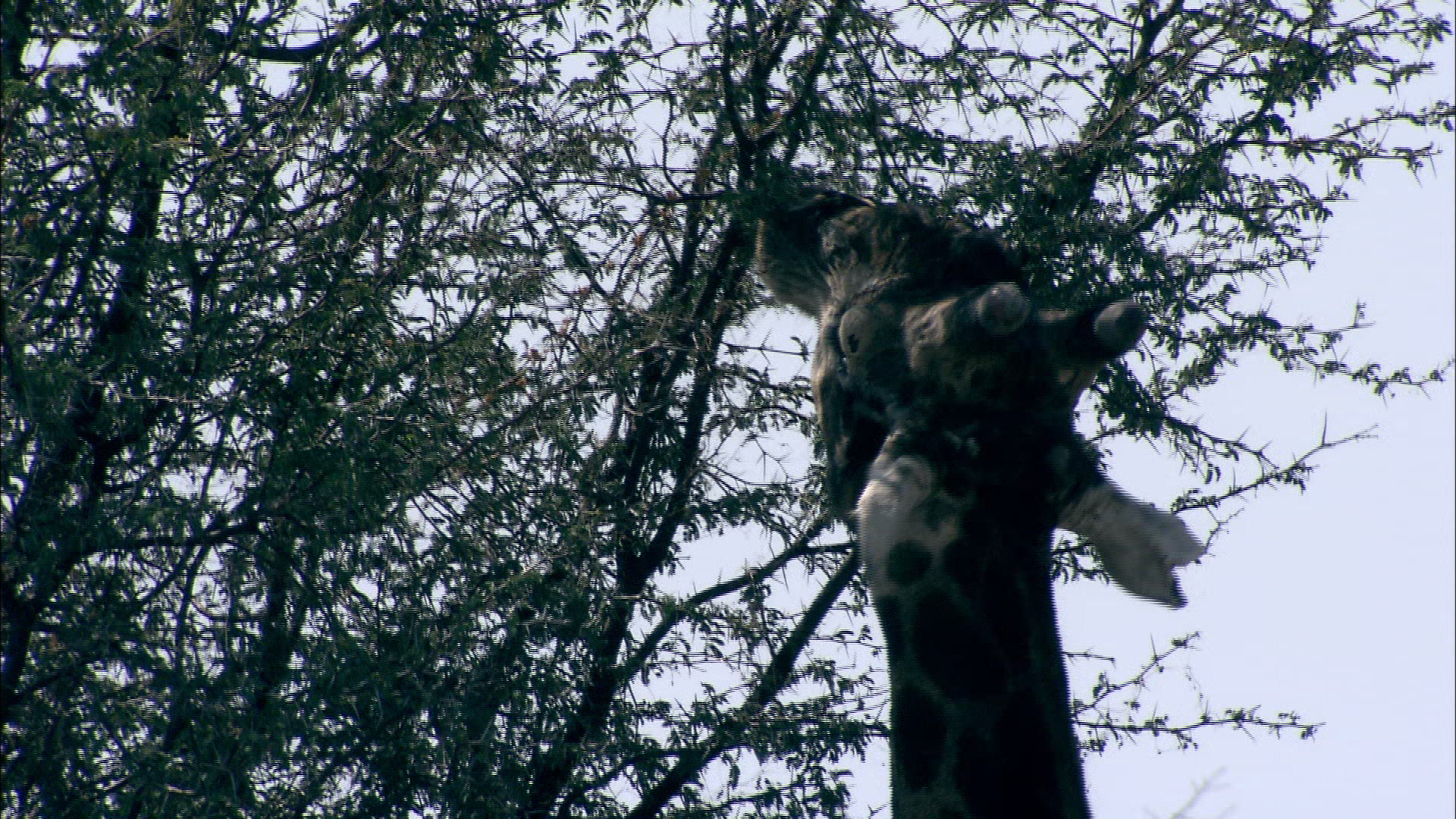 > Close-up of a giraffe eating off branches in a tree