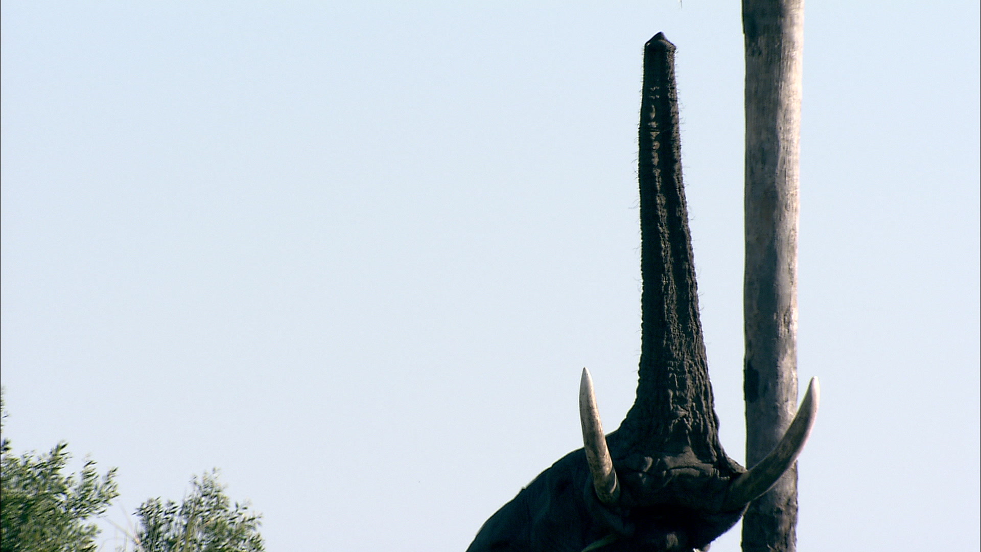 Handheld mid shot of an elephant trying to reach leaves with its trunk
