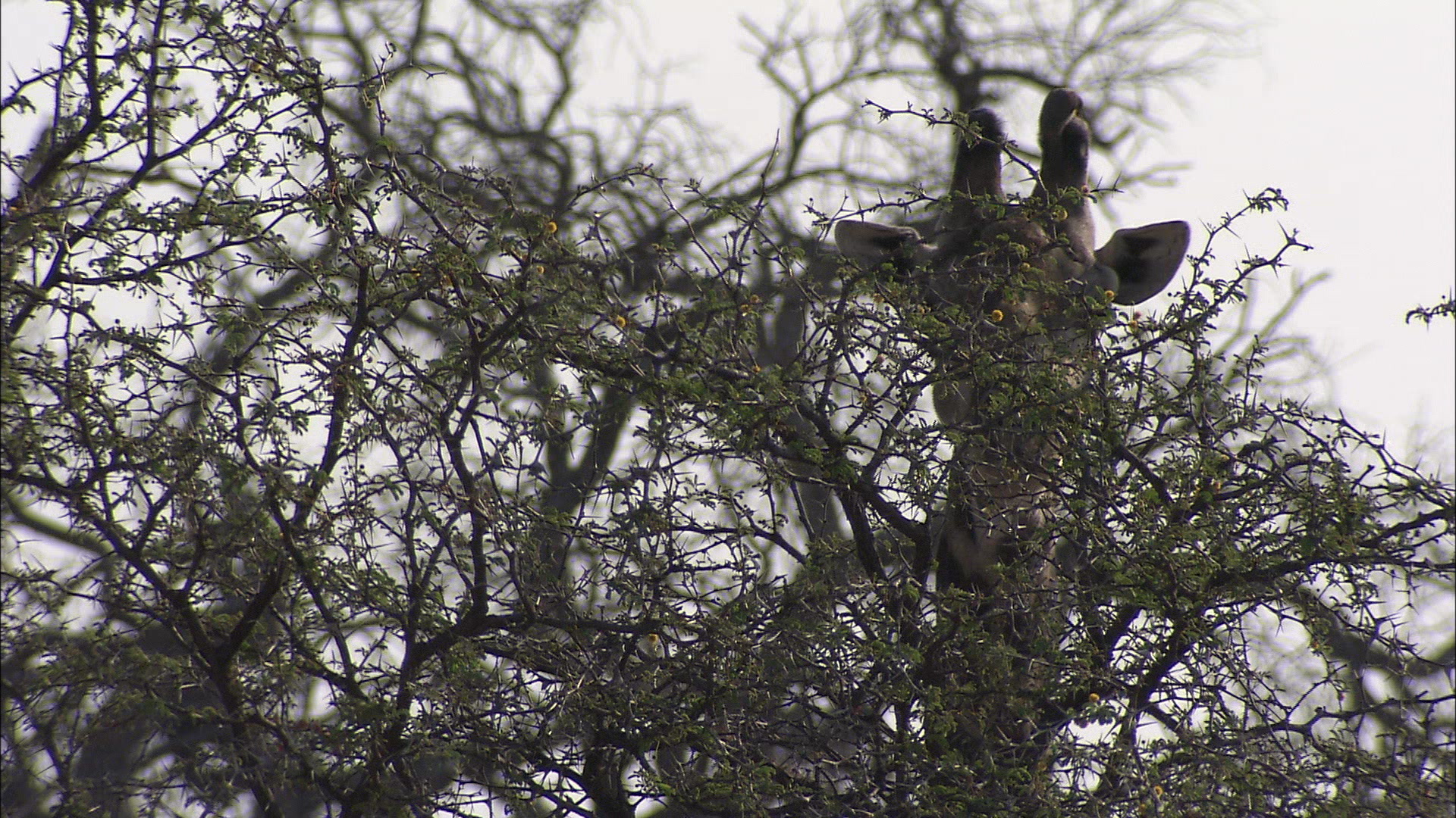> Mid shot of a giraffe standing behind a tree while a bird sits on its head