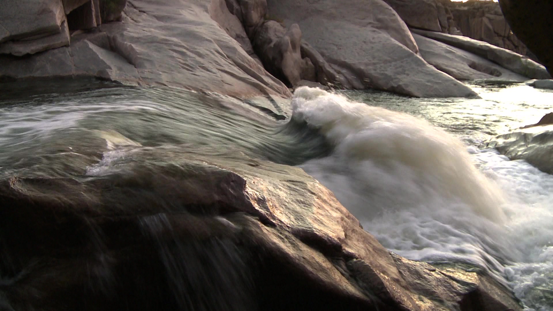 2563424 - Locked off mid shot of water flowing rapidly over rocks