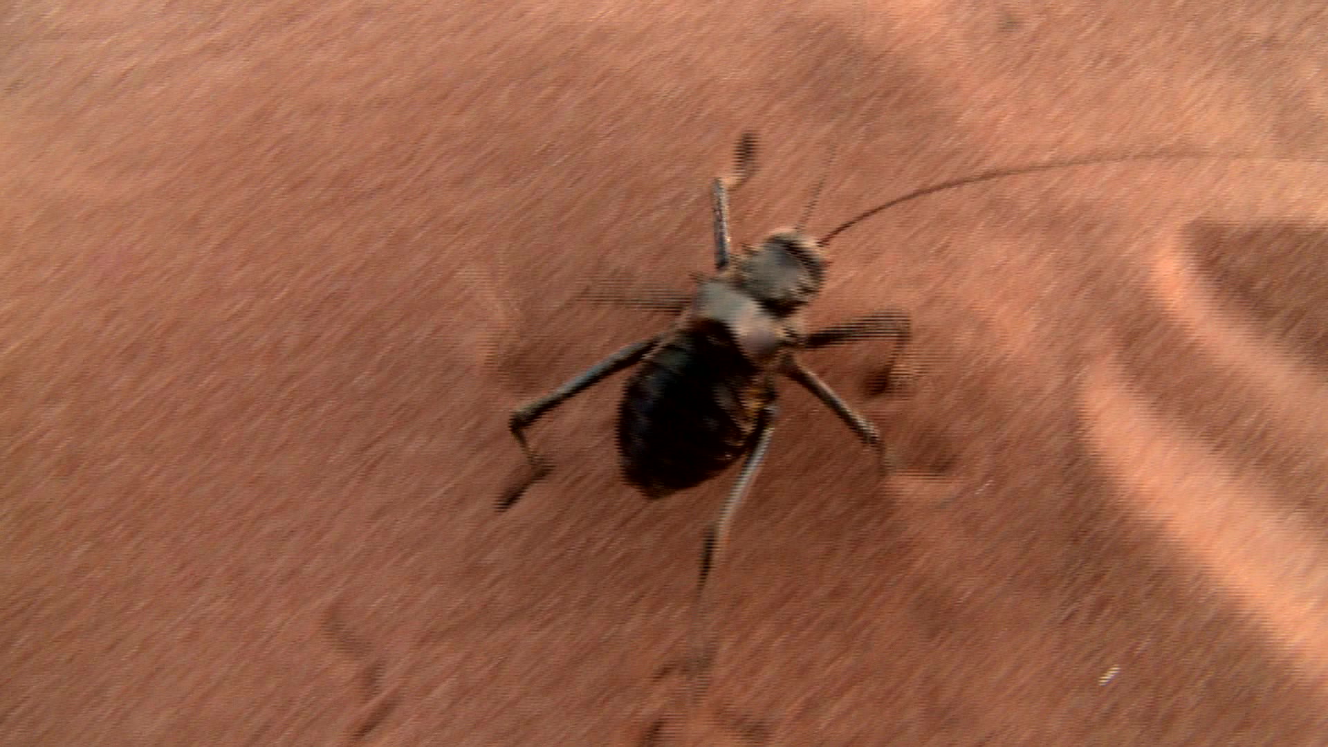 > Cricket walking across desert sand