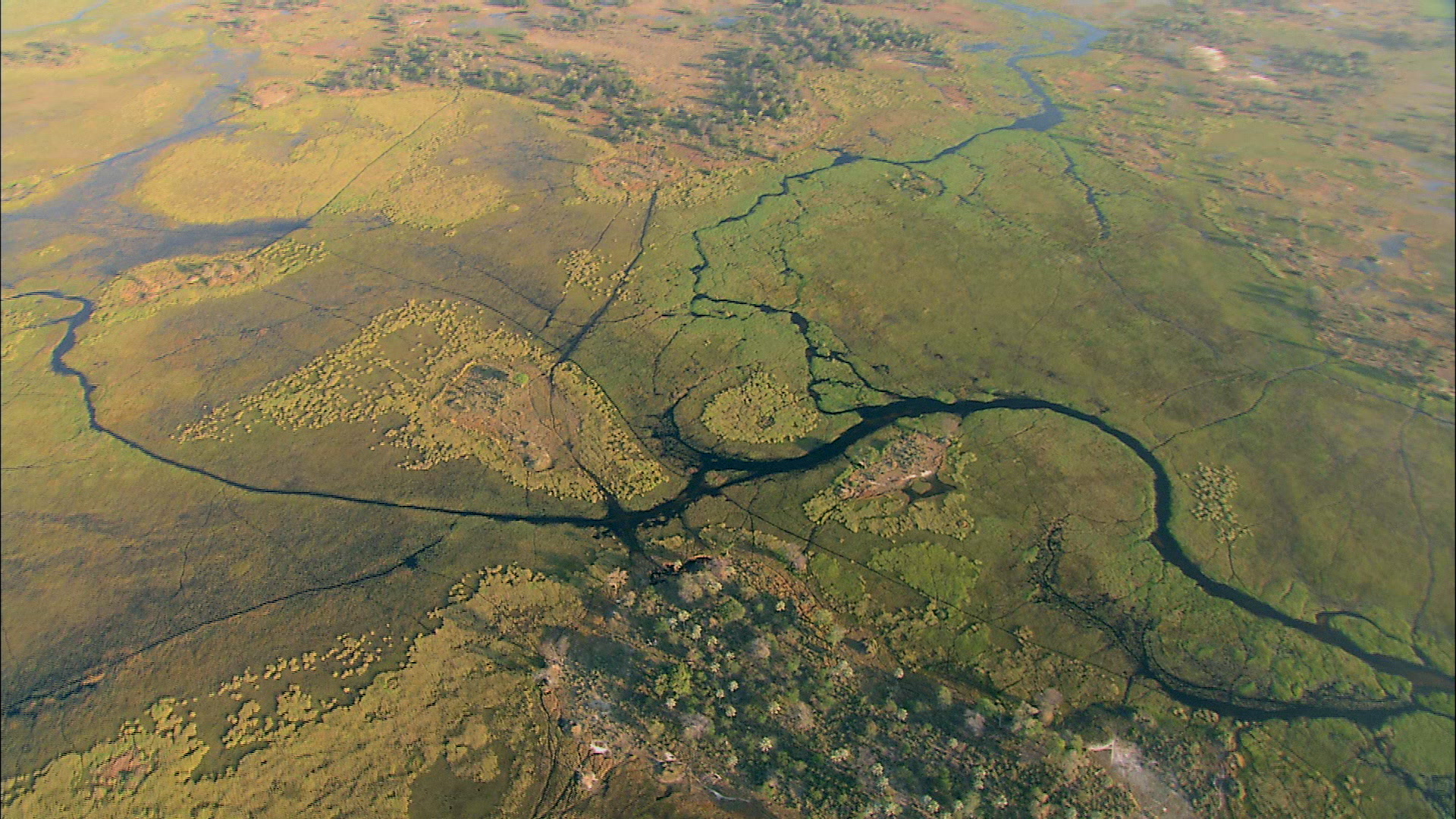 > Oblique aerial shot of the Okavango Delta