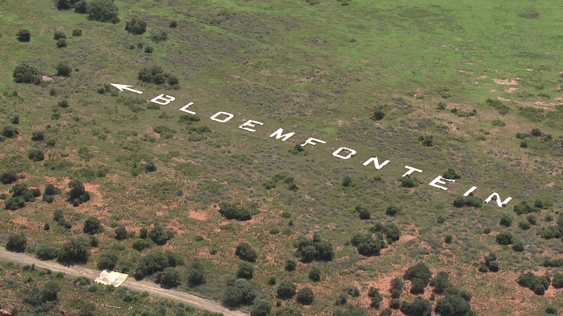 > Aerial shot of a white rocks making up the word Bloemfontein