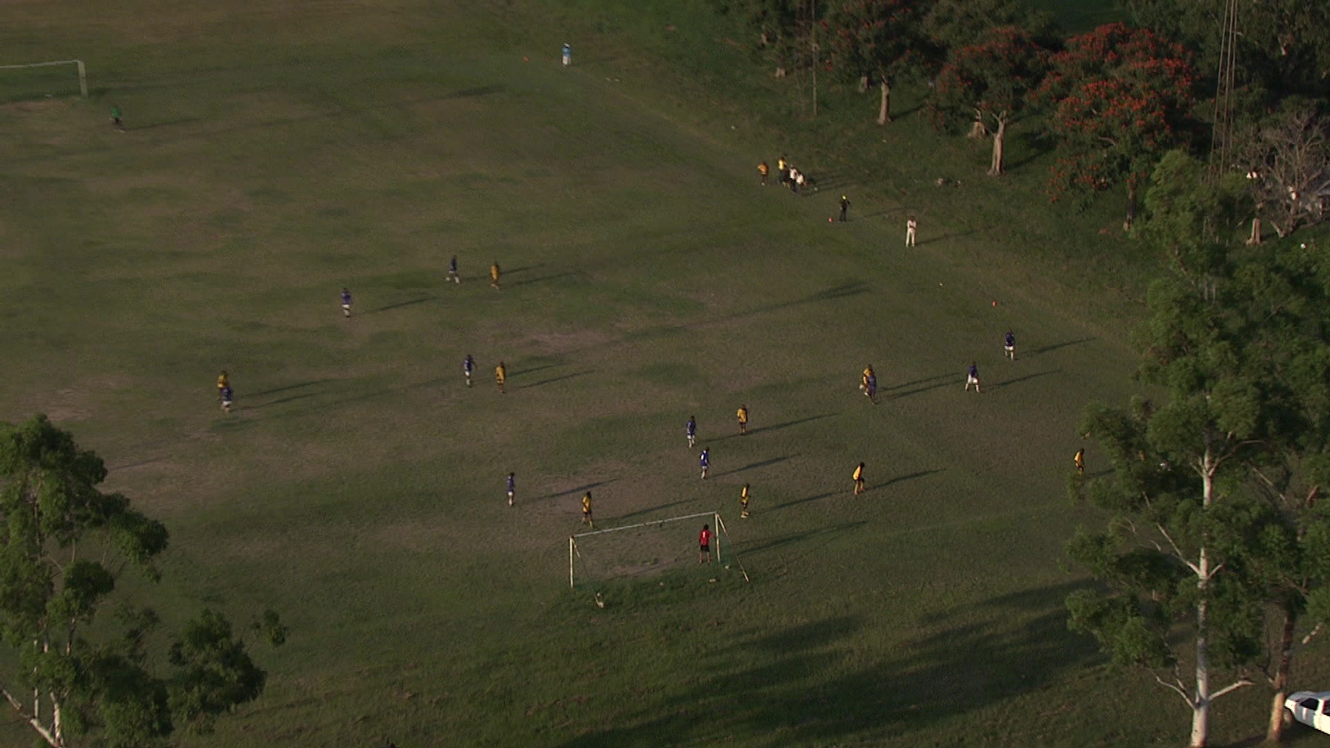 > Aerial shot of a group of people playing soccer