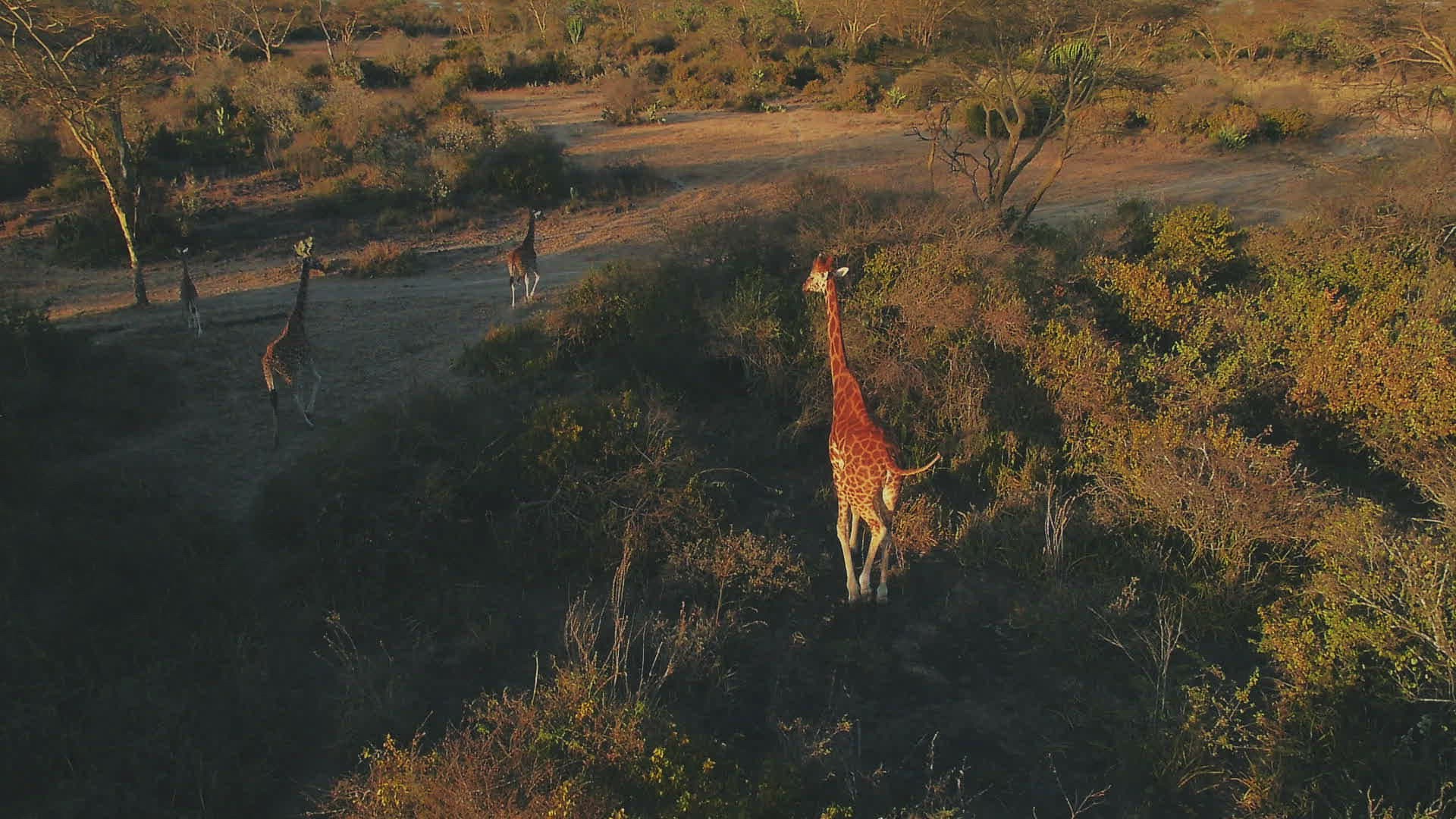 > Aerial shot of a group of warthogs