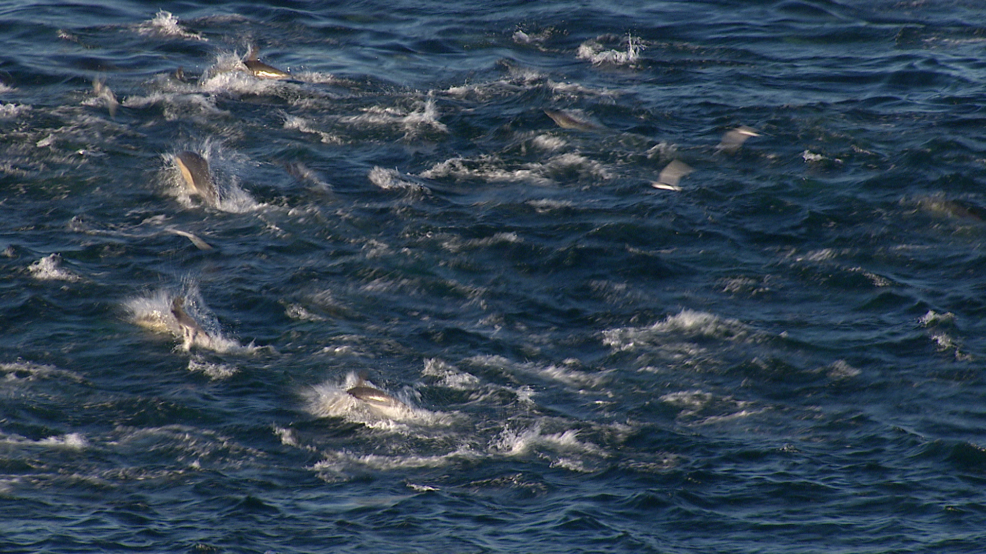 > Aerial of a school of dolphins leaping in and out of the ocean