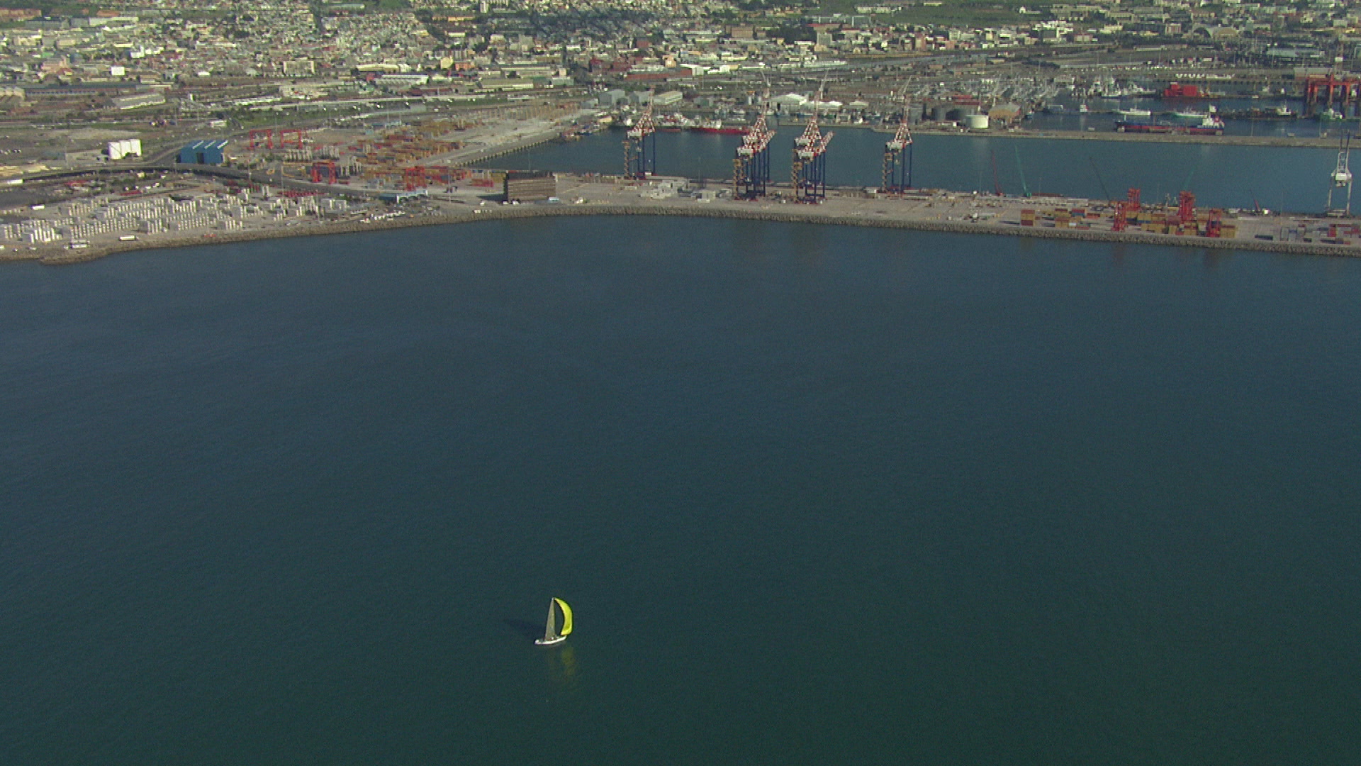Aerial shot of a boat sailing towards Cape Town Harbour