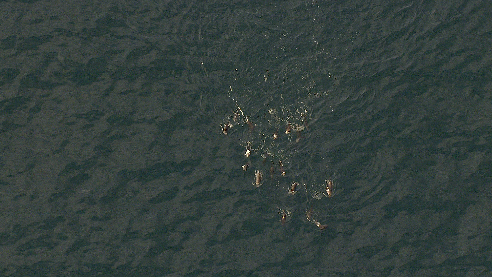 > Aerial view of Common Dolphin swimming off the coast of the Western Cape