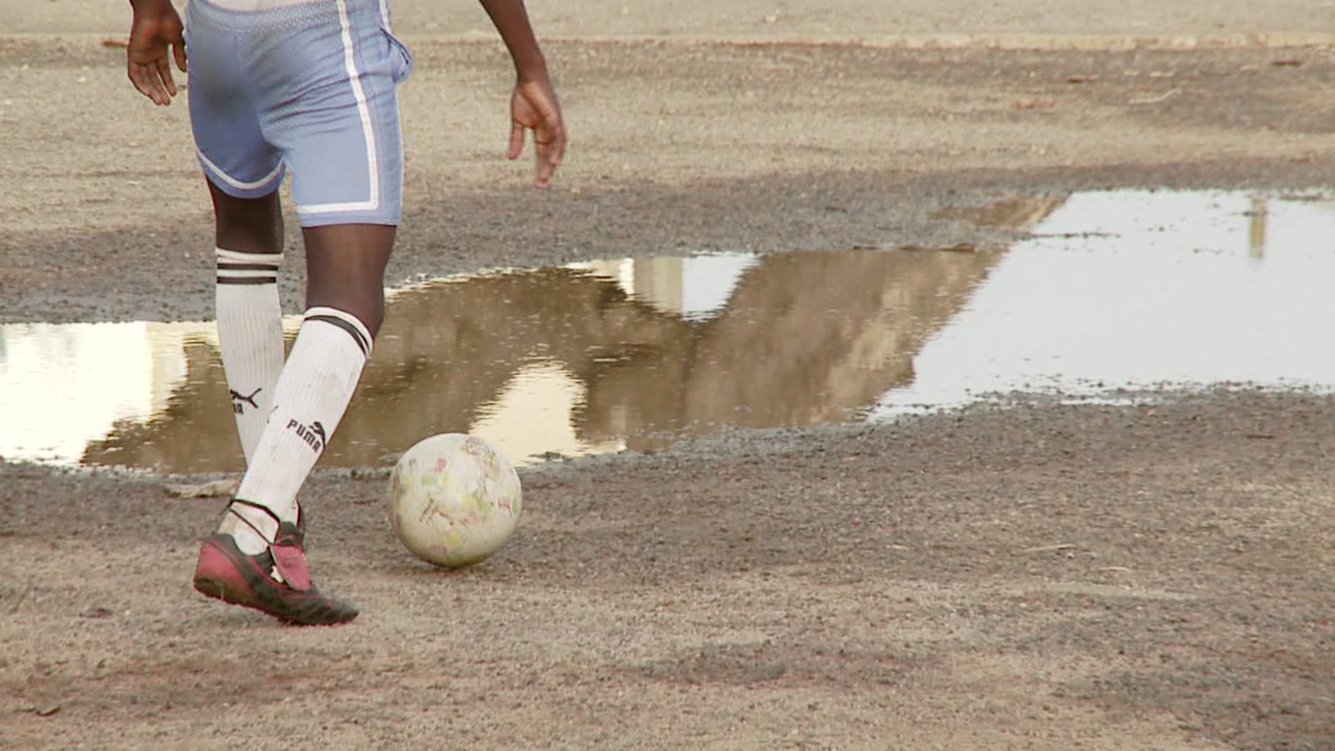 Handheld panning medium shot of young adult dribbling soccer ball