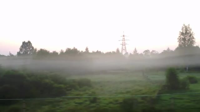 View from a moving train of countryside in a fog in summer