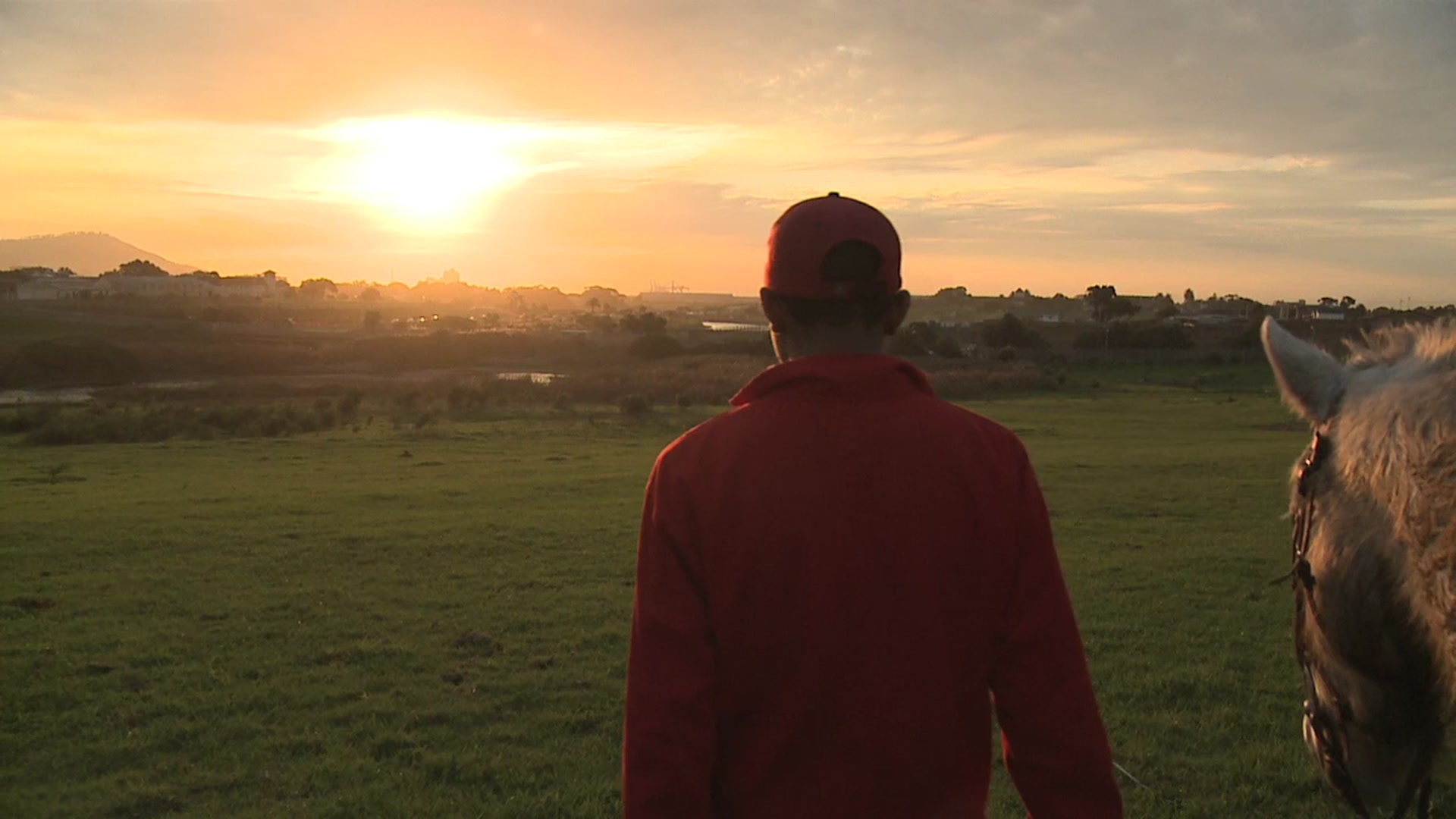 > Mid shot of a young farm worker walking a horse