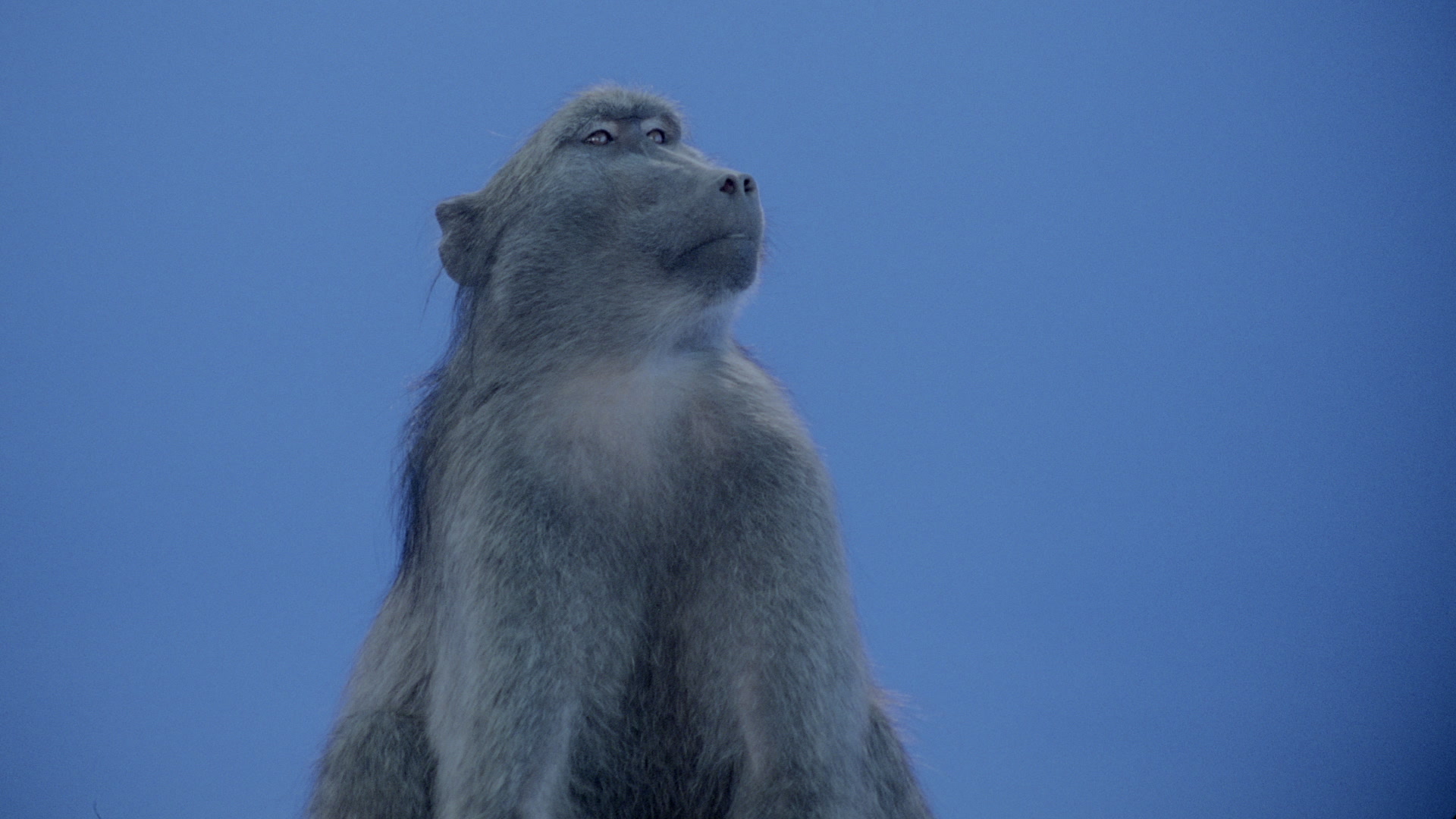 > Close-up of a baboon looking up then tends to lean to one side as if avoiding something