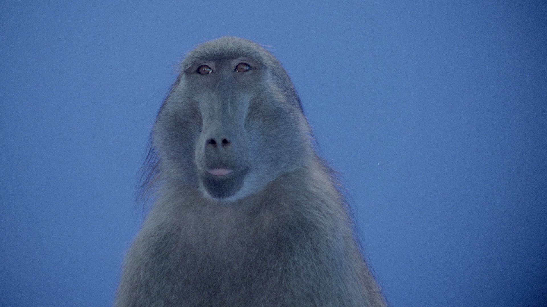 > Close-up of a baboon's face as it stares and looks up