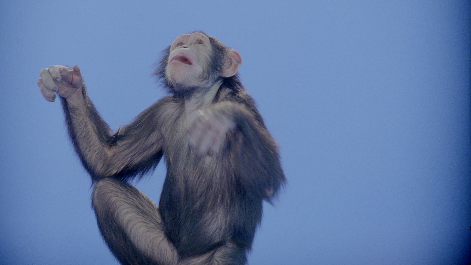 > Medium shot of a chimpanzee eating its food, scratching looking up and reaching upwards