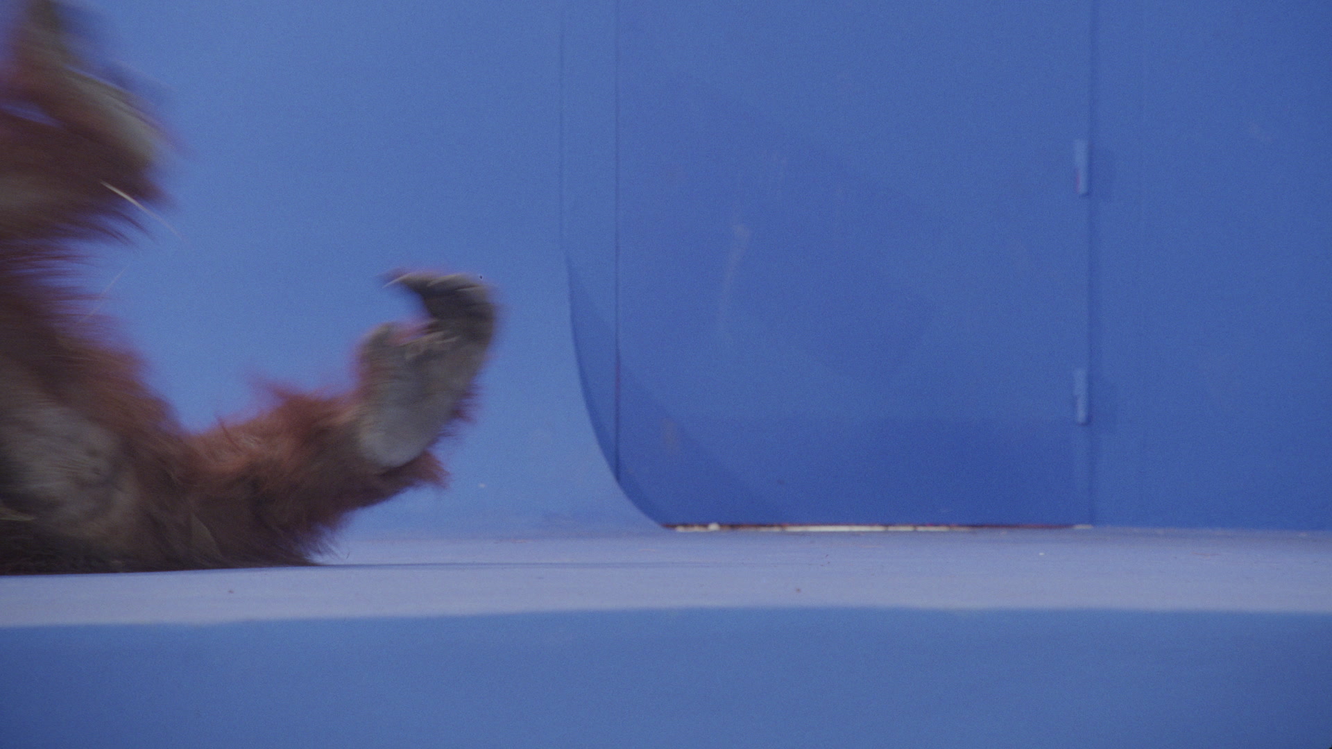 > Medium shot of a orang-utan rolling around then getting up and walking off