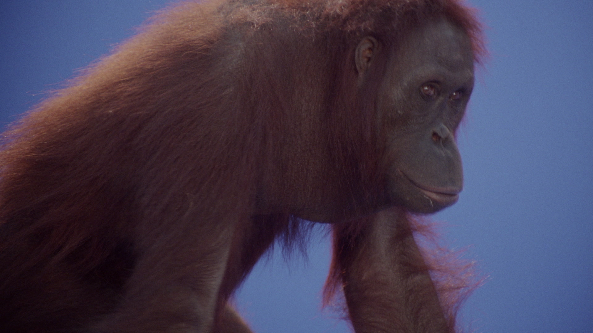 Close-up of an orang-utan face as it moves away, the camera follows as it picks up something to eat