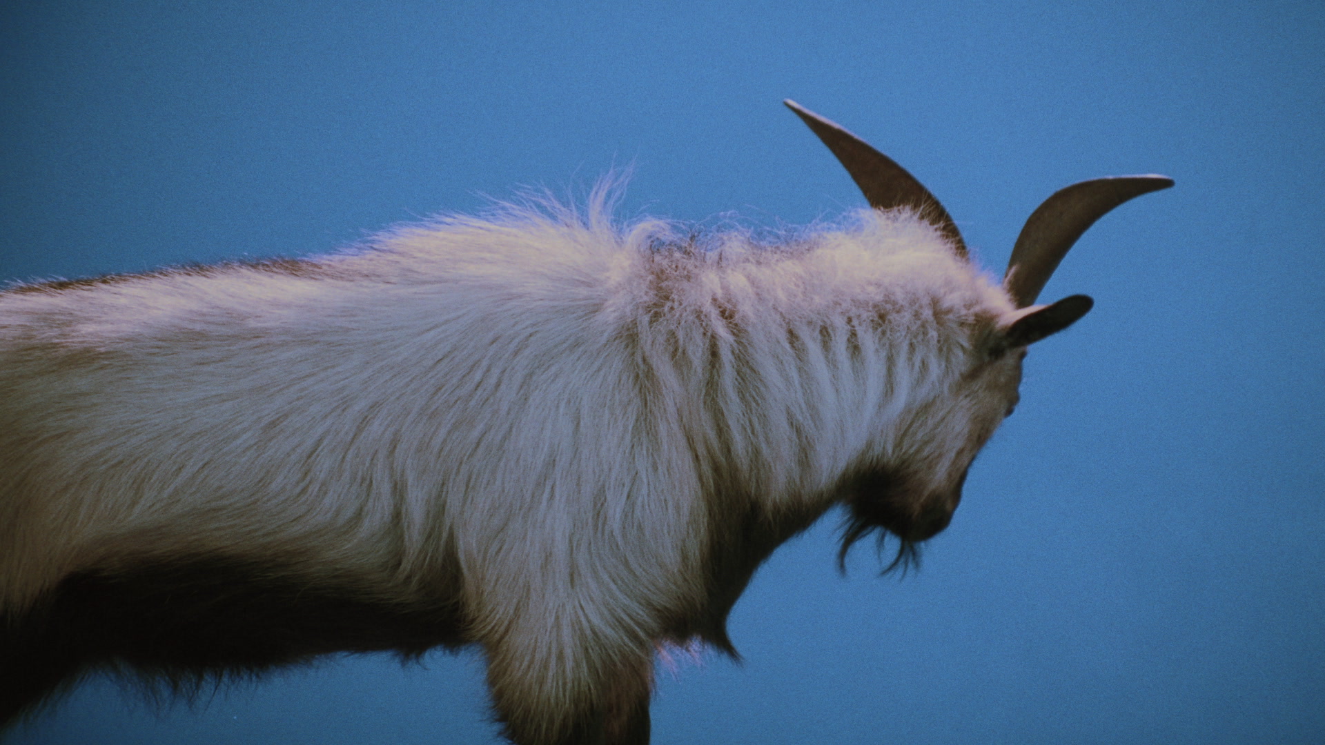 > Medium shot of a goat bleating as it looks around