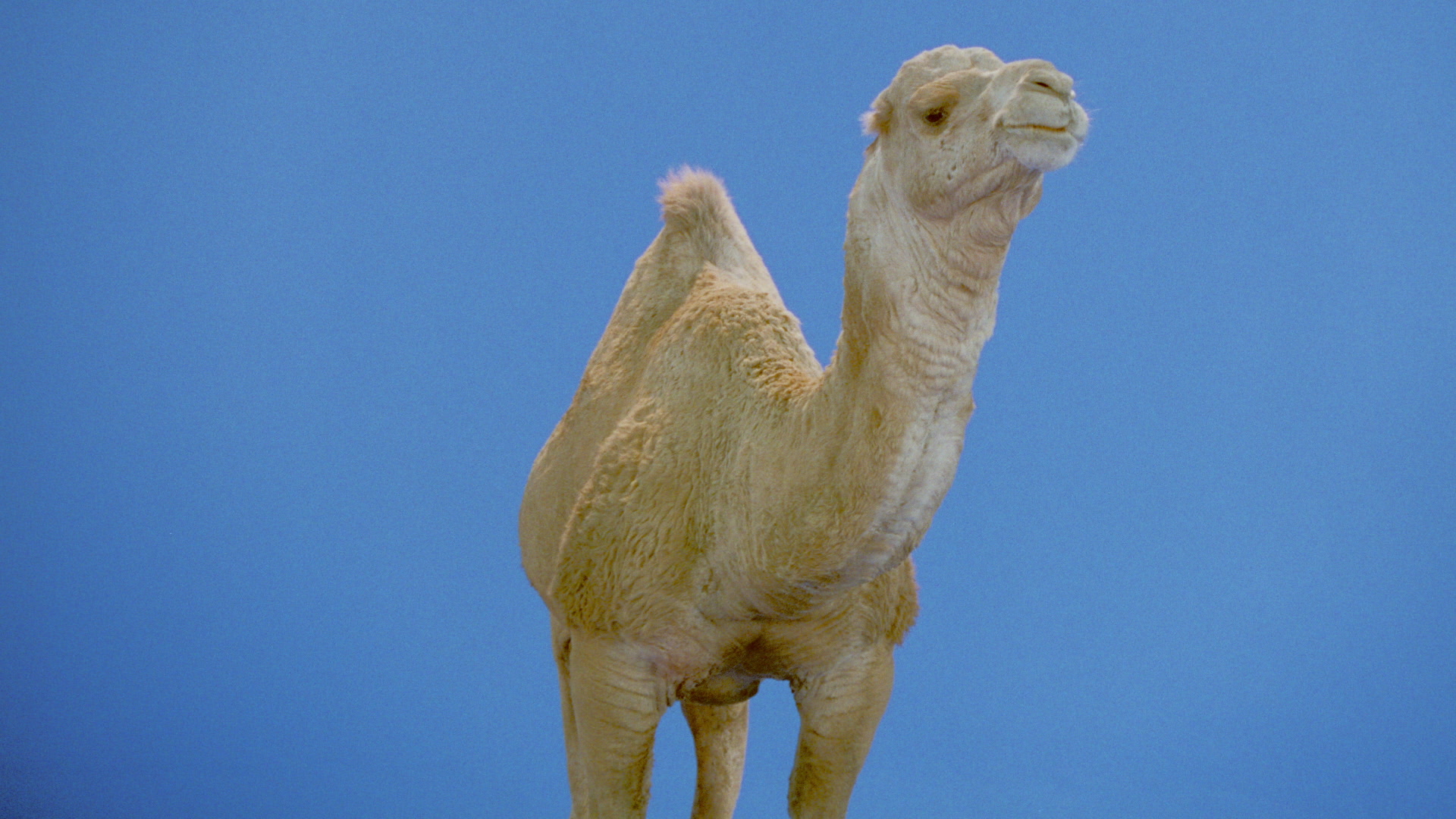 2565399 - Medium shot of a single hump camel walking on and stopping