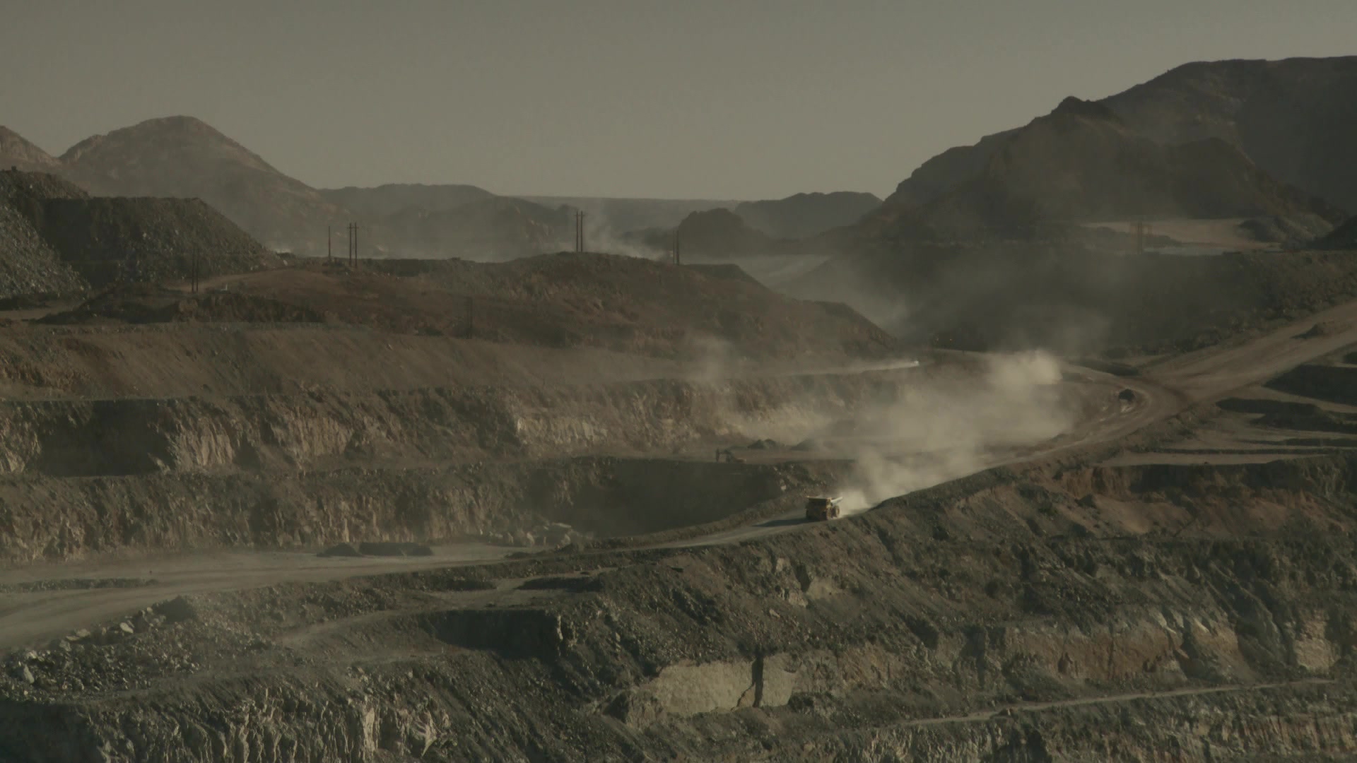 > Long shot of construction vehicle driving through opencast mine