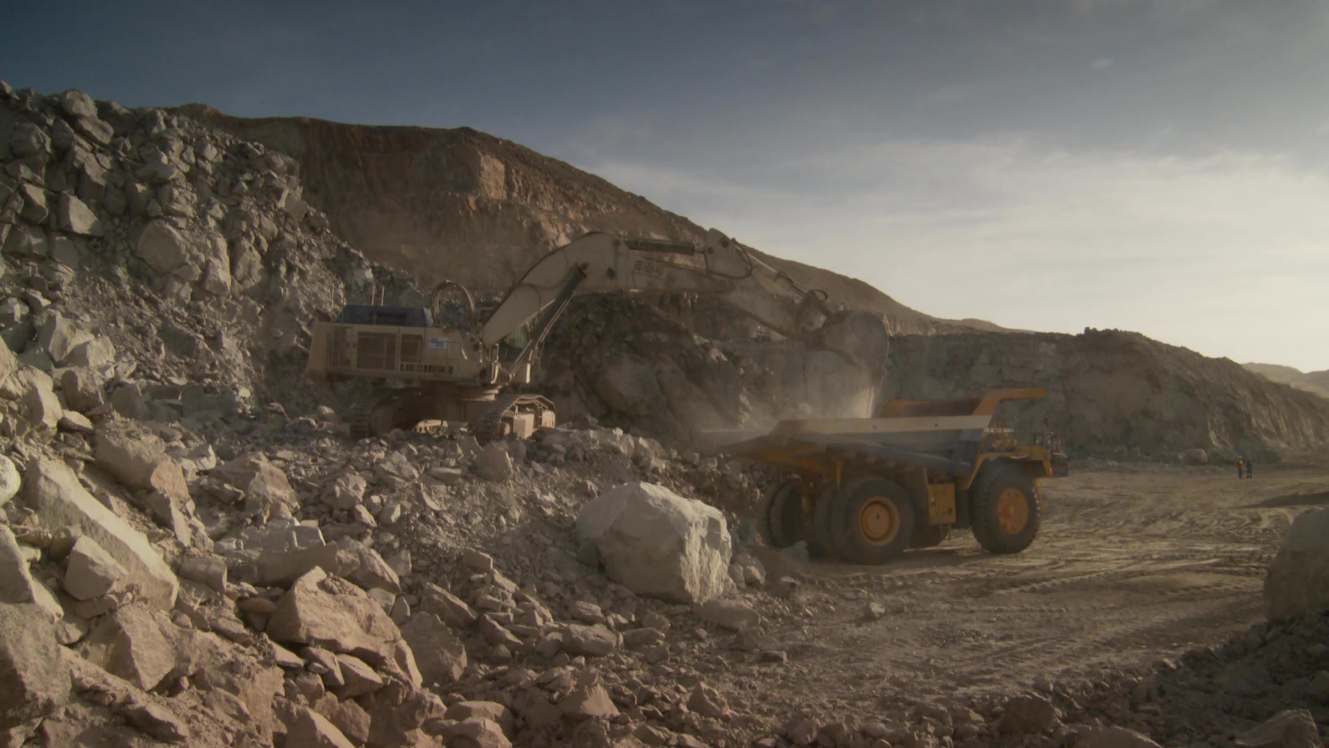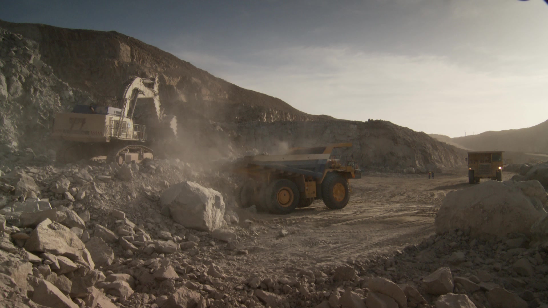 2565501 - Long shot of a dump truck being loaded by another construction vehicle while another construction vehicle approaches