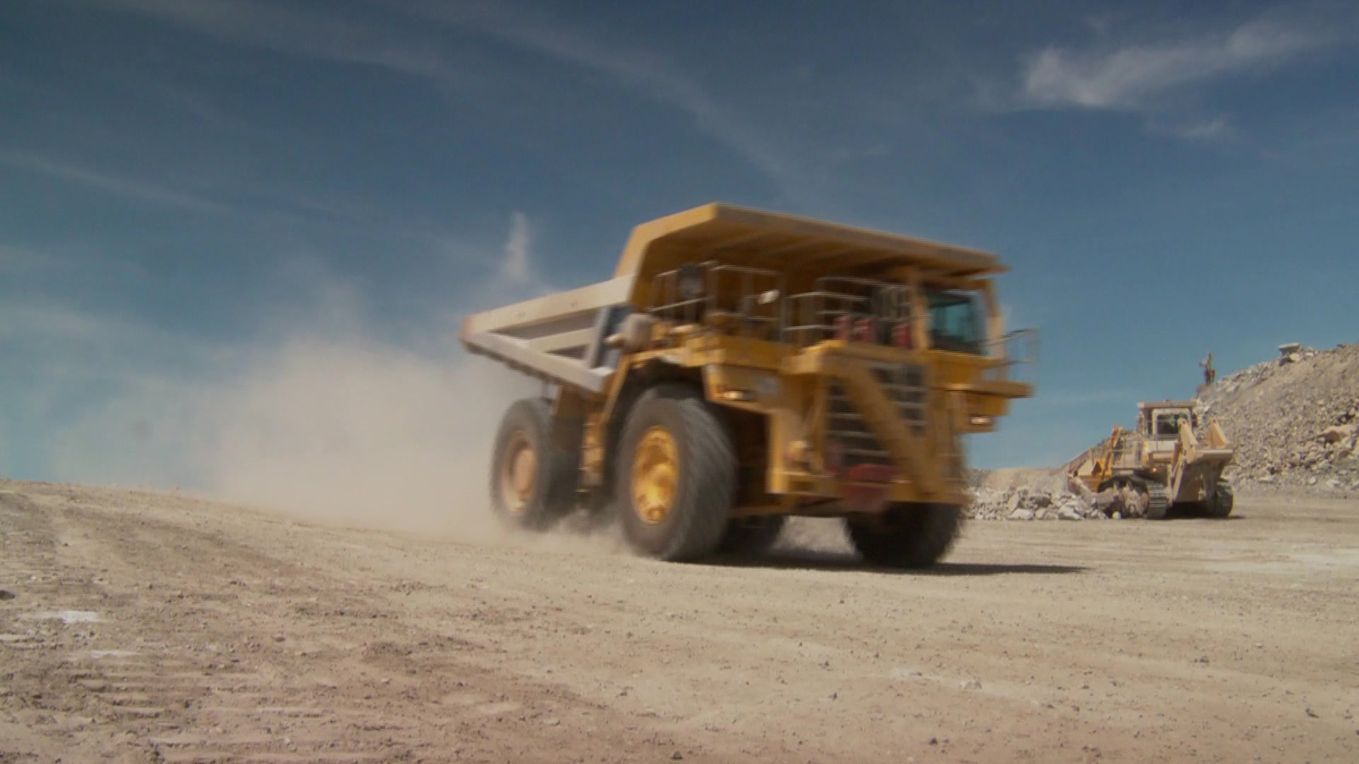 Mid shot of a dump truck driving past