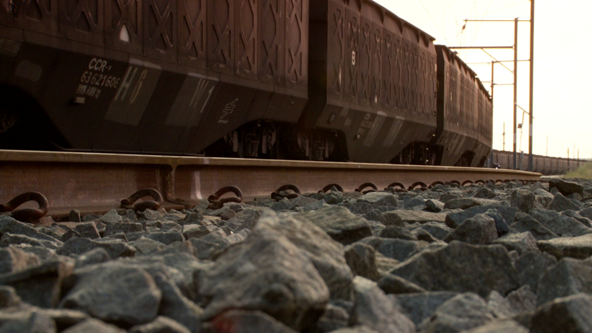 > Long shot of a freight train moving along the track