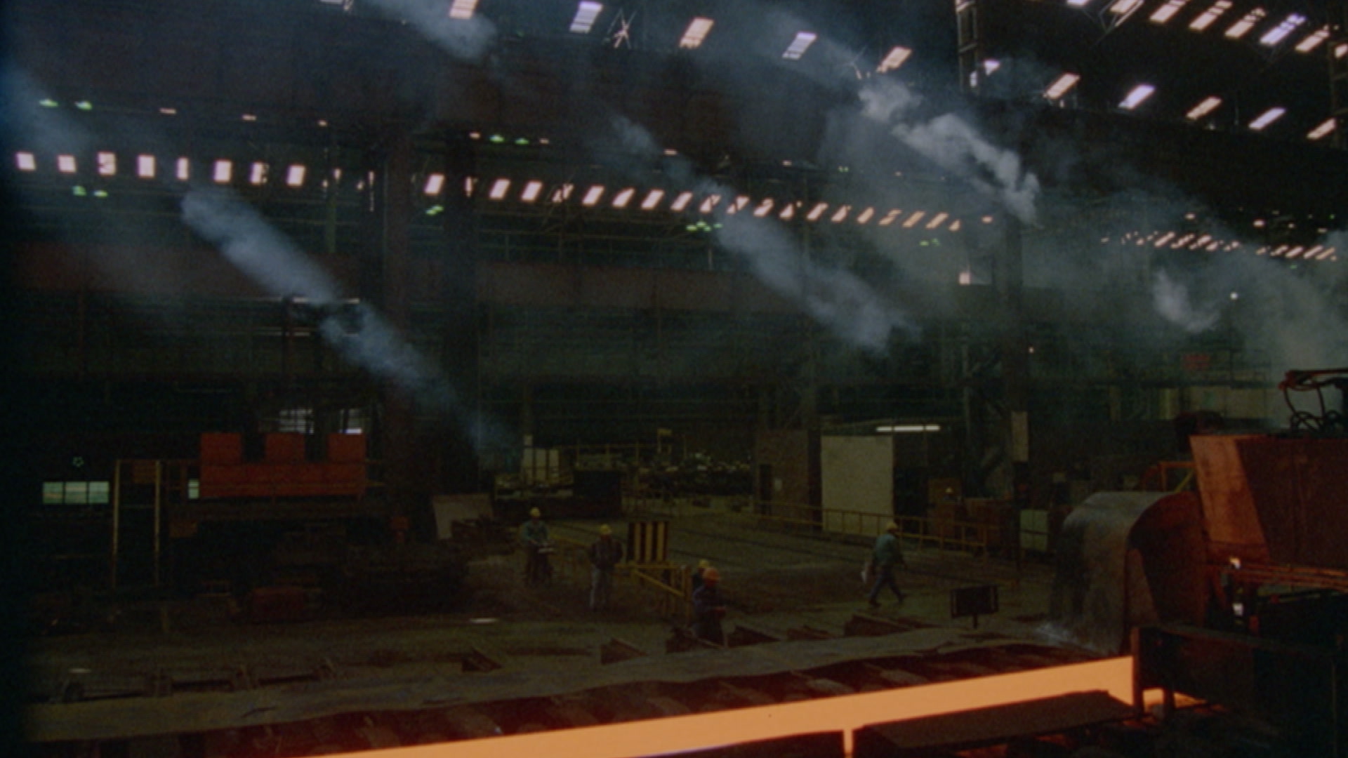 > Long angled shot of a hot glowing sheet of metal moving along a track